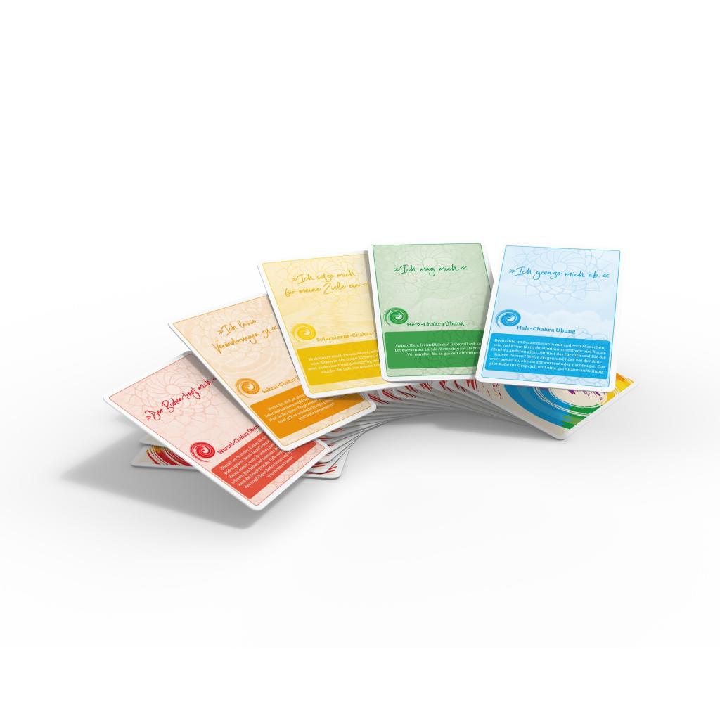 Sieben Chakren - Sieben Lebensfragen 49 Karten zur Aktivierung und Stärkung deiner Energiezentren Die Chakren - unsere Energiezentren - spielen eine ganz entscheidende Rolle für unser körperliches und seelisches Wohlbefinden. Wenn sie blockiert oder zu stark geöffnet sind, kann unsere Energie gebremst sein oder überschießend verpuffen. Schaffst du es, einen harmonischen Energiefluss herzustellen, kannst du dein ganzes Potential einsetzen, um positiv mit dem Leben umzugehen, Herausforderungen standzuhalten und die richtigen Entscheidungen zu treffen. Die Karten, die du ziehst, zeigen dir, auf welches Chakra du dich konzentrieren solltest und sie helfen dir, über Mediation, Affirmationen und Selbstreflexion die richtigen Lebensfragen zu erkennen und zu beantworten. Du kannst eine beliebige Karte aus dem Stapel ziehen oder dir die Karten für ein bestimmtes Chakra zurechtlegen. Deine Intuition wird dich leiten und dich ganz einfach auf den für dich richtigen Weg führen. Die sieben Lebensfragen Soll ich bleiben oder soll ich gehen? Kann ich loslassen? Übernehme ich Verantwortung? Kann ich mich selbst lieben? Wie gehe ich mit Distanz und Nähe um? Vertraue ich meiner Intuition? Fühle ich mich mit der Welt verbunden? Inhalt: 49 Karten und 144-seitiges Booklet
