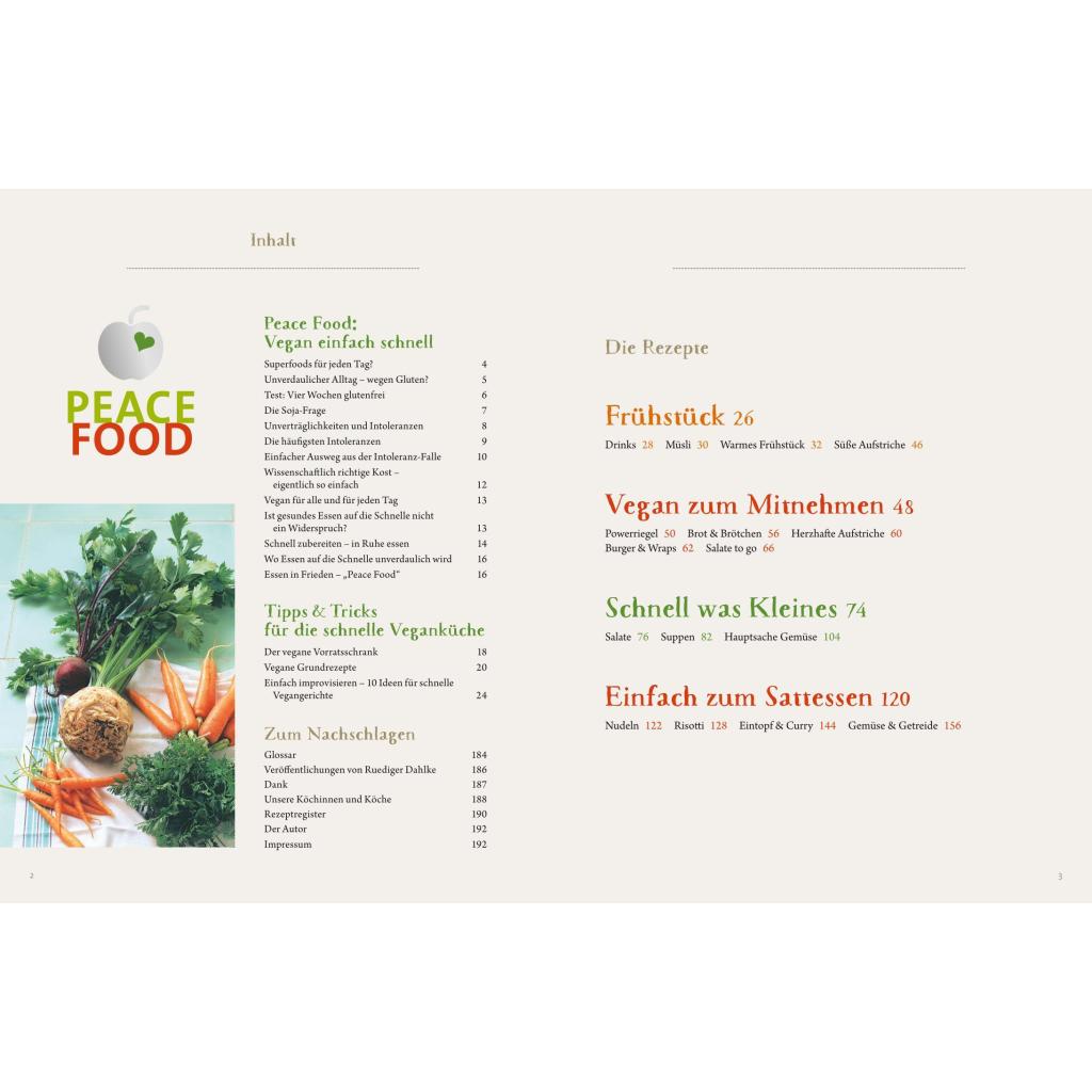 PEACE FOOD - Vegan einfach schnell ist die kulinarische Weiterführung der Bestseller zur veganen Ernährung von Ruediger Dahlke. In seiner Einleitung beschreibt der Autor, wie eine rein pflanzliche Ernährung ein regelrechtes Schutzschild aufbaut gegen Krankheiten der Moderne. Er erklät in diesem Buch, wie einfach und schnell sich vegane Gerichte im Alltag zubereiten lassen. Dahlkes Lieblingsköche zaubern dafür am Herd: 90 köstliche vegane Gerichte, die den Umstieg leicht machen.