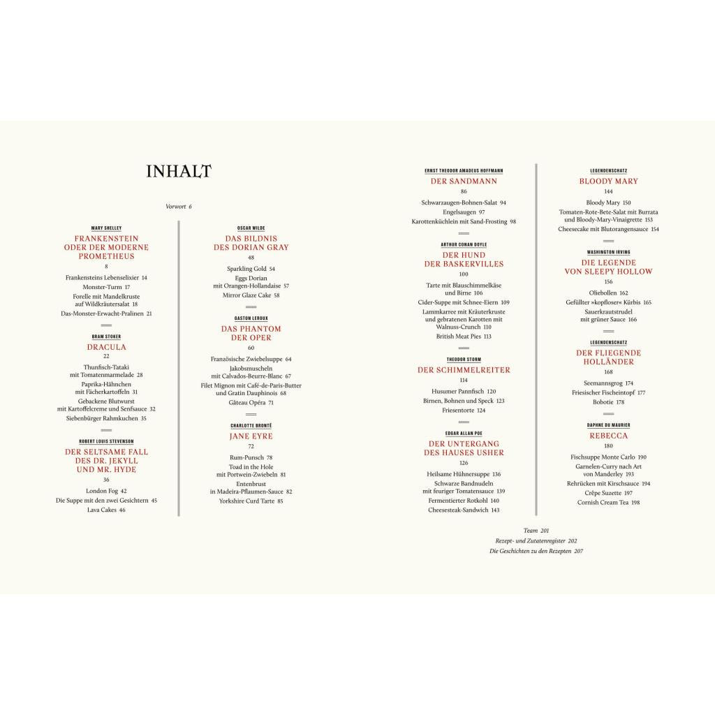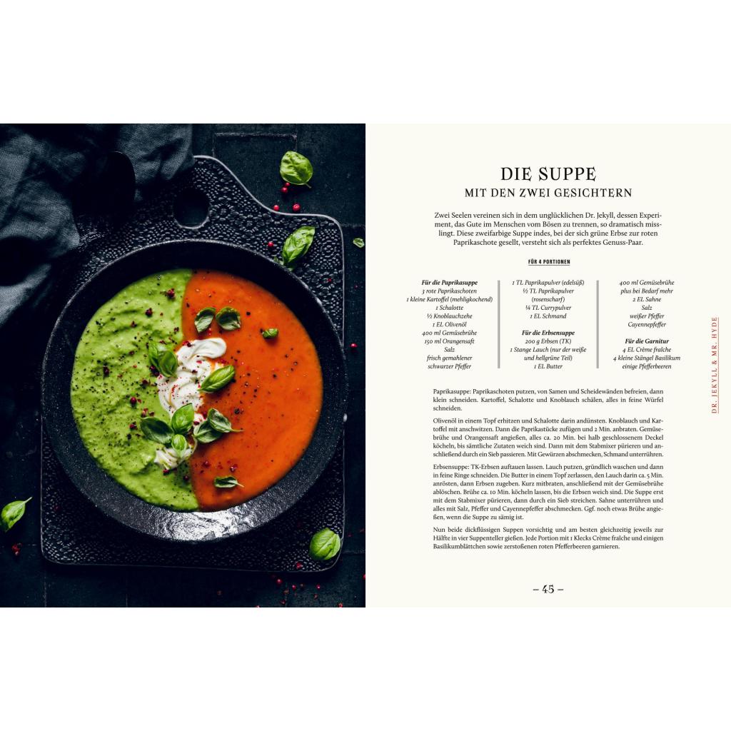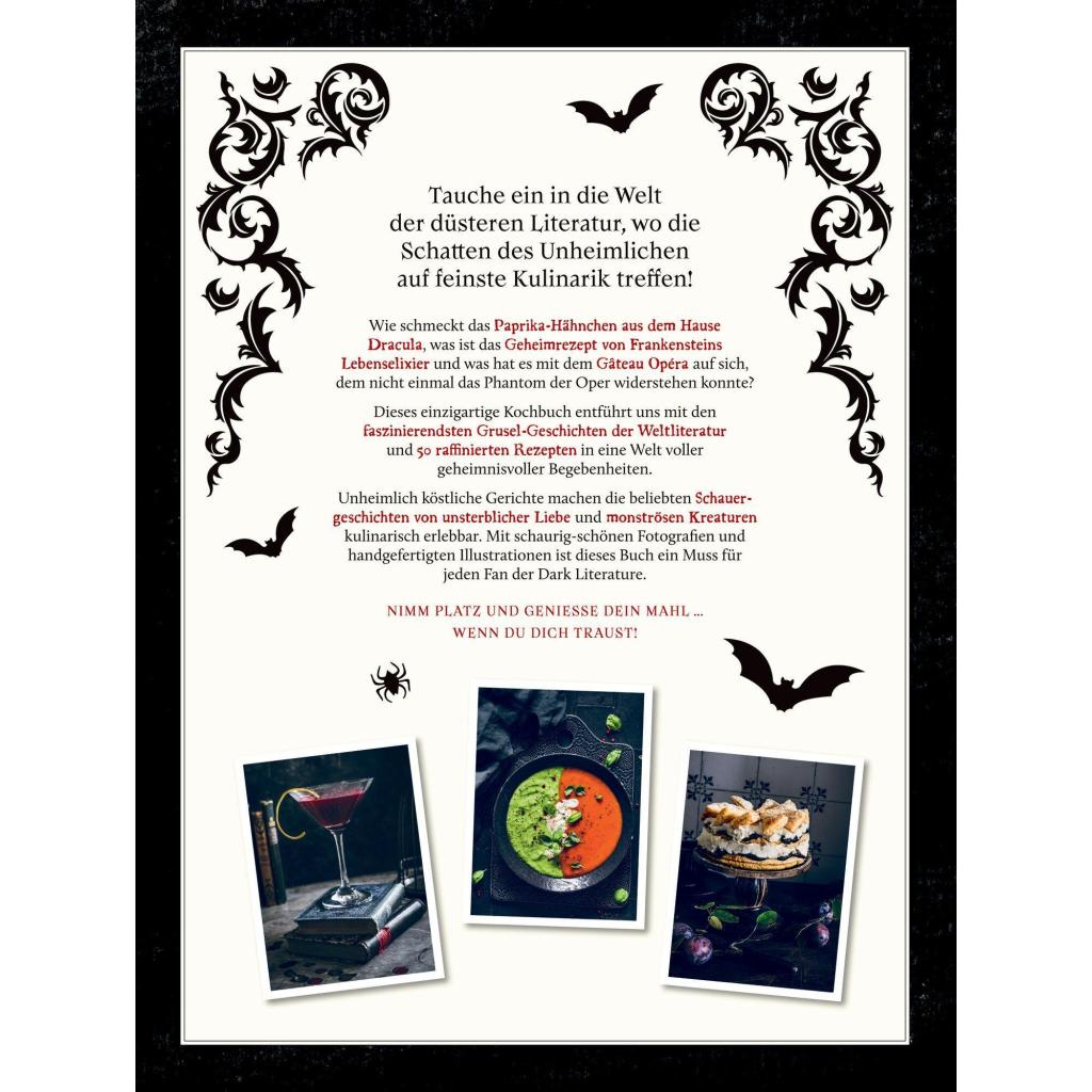 Wie schmeckt das Paprika-Hähnchen aus dem Hause Dracula, was ist das Geheimrezept von Frankensteins Lebenselixier und was hat es mit dem Gâteau Opéra auf sich, dem nicht einmal das Phantom der Oper widerstehen konnte? Dieses einzigartige Kochbuch entführt uns mit den faszinierendsten Grusel-Geschichten der Weltliteratur und 50 raffinierten Rezepten in eine Welt voller geheimnisvoller Begebenheiten. Unheimlich köstliche Gerichte machen die beliebten Schauergeschichten von unsterblicher Liebe und monströsen Kreaturen kulinarisch erlebbar. Mit schaurig-schönen Fotografien und handgefertigten Illustrationen ist dieses Buch ein Muss für jeden Fan der Dark Literature. Nimm Platz und genieße dein Mahl ... wenn du dich traust!