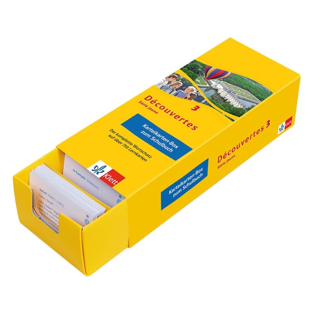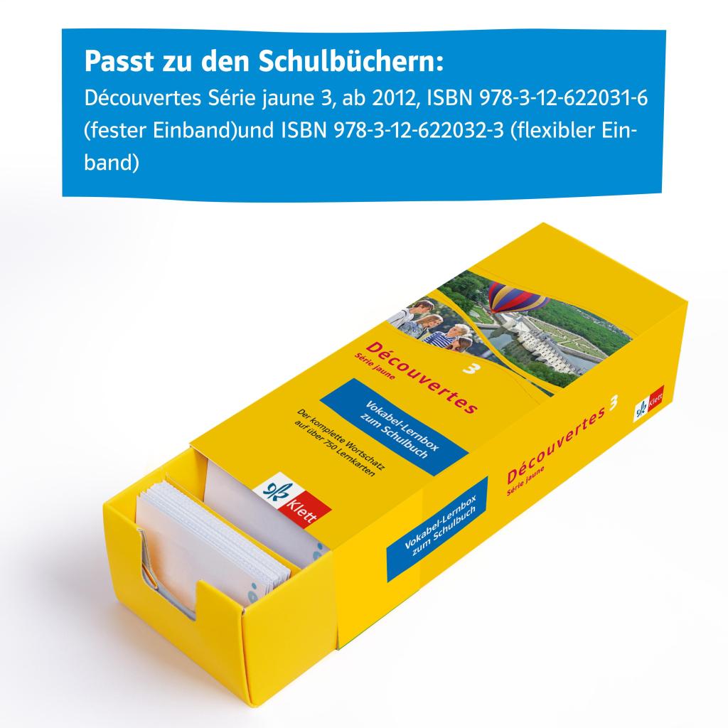 Französisch-Vokabelbox passend zum Schulbuch: Passt zu den Schulbüchern Découvertes 3 Série jaune ISBN: 978-3-12-622031-6 (fester Einband) und ISBN: 978-3-12-622032-3 (flexibler Einband) Diese Vokabel-Lernbox bietet: Die Original-Vokabeln des Schulbuches Über 750 Lernkarten mit Beispielsätzen und vielen hilfreichen Hinweisen Alle Beispielsätze mit Übersetzung Ausführliche Anleitung mit Lerntipps Zusätzliche Leerkarten, mit denen die Box individuell erweitert werden kann