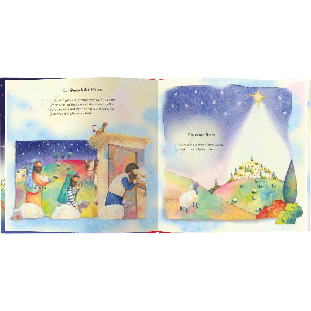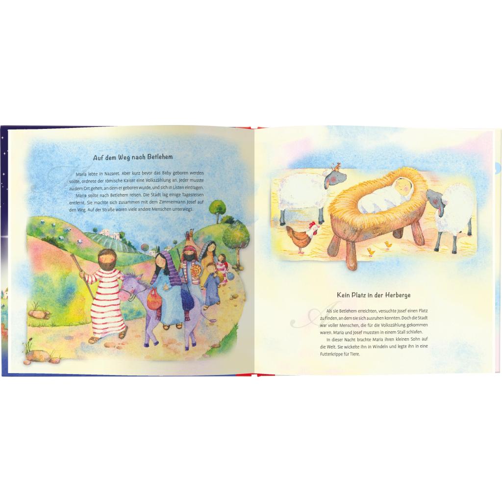 Von Nazareth in den Stall von Bethlehem: Die biblische Weihnachtsgeschichte Maria erfährt von einem Engel, dass sie Gottes Sohn zur Welt bringen wird. Zusammen mit Josef muss sie sich hochschwanger auf den Weg nach Bethlehem machen. Dort besuchen Hirten und die 3 Heiligen Drei Könige sie und den neugeborenen Jesus im Stall. Die Weihnachtsgeschichte wird mit diesem Pop-Up Buch für Kinder ab drei Jahren begreifbar. Gemeinsam mit dem Vorlesenden spüren sie dem langen Weg der Heiligen Familie nach. - Ein Kinderbuch zur Weihnachtszeit: interaktives Bilderbuch mit zauberhafter Pop-Up-Krippe - Warum feiern wir Weihnachten? Die Geschichte von Jesu Geburt nacherzählt - Weihnachtsbuch ab 3 Jahren mit Adventskalendertürchen auf einer Doppelseite - Liebevoll illustriert: Weihnachtsgeschichte für den Kindergarten und zu Hause als Geschenkidee zu Nikolaus - Jesus wird geboren: Zusammen mit den Hirten und den drei Weisen auf zum Stall von Bethlehem Die Geschichte von Weihnachten - erzählt für Kinder ab drei Jahren Was hat es mit dem Kind in der Krippe auf sich und wieso sind Esel, Ochs und viele Menschen in dem kleinen Stall versammelt? Sally Ann Wright hat die biblische Weihnachtsgeschichte einfühlsam für kleine Kinder nacherzählt. Schritt für Schritt begleiten sie Maria auf ihrem Weg nach Bethlehem und hören die Geschichte von Jesu Geburt. Die 24 Türchen mit kleinen Bildern verkürzen zusätzlich das Warten auf Heiligabend. Und die Pop-Up-Weihnachtskrippe wird zum Blickfang im Kinderzimmer! So erfahren auch die Jüngsten altersgerecht, was den Zauber von Weihnachten ausmacht.