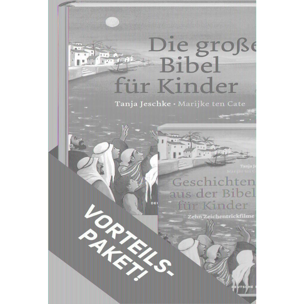"Die große Bibel für Kinder" und die DVD mit ausgewählten "Geschichten aus der Bibel für Kinder" im preisgünstigen Kombi-Paket! Die große Bibel für Kinder in der 17. verbesserten und erweiterten Neuauflage! Rundum neu! Wesentliches bleibt gewohnt gut und relevante Geschichten kommen hinzu. Natürlich mit neuen, umwerfenden Illustrationen! Wer in Zukunft "Die große Bibel für Kinder" in die Hand nimmt, wird noch begeisterter sein. Wir haben uns die Mühe gemacht, die Auswahl der Geschichten noch klarer auf die Bedürfnisse in Familie, Kindergarten und Gemeinde abzustimmen. Wer bisher etwa die Geburt von Mose, die Geschichte von der Sturmstillung, das Gleichnis vom verlorenen Schaf oder den Einzug in Jerusalem vermisst hat, kommt hier voll auf seine Kosten. Dieser außerordentlich erfolgreiche Titel, der bereits 2015 mit dem Christlichen Buchpreis für die beste Kinderbibel prämiert wurde, zeichnet sich aus durch die sehr einfühlsame und lebendige Nacherzählung von Tanja Jeschke und die besonders farbenfrohen Illustrationen von Marijke ten Cate, in denen Zwischenmenschliches - Beziehungen und Gefühle - besonders gut sichtbar werden. Mit einem Nachwort für die Erwachsenen. Das hat sich geändert: Als neue Geschichten sind die Sturmstillung und das Gleichnis vom verlorenen Schaf aufgenommen worden. Die Erzählung zu Nehemia ist entfallen. Ergänzt wurde die Berufung Abrahams, die Geschichte von Mose im Körbchen und seine Flucht aus Ägypten, die Freudenfeier nach dem Auszug aus Ägypten, die Salbung von David zum König durch den Propheten Samuel und im Rahmen der Passionserzählung der Einzug Jesu in Jerusalem, sowie der Verrat durch Judas und das Abendmahl. Geschichten aus der Bibel für Kinder Zehn Geschichten aus: 'Die große Bibel für Kinder' werden auf dieser DVD lebendig. Die Zeichentrickfilme, die in ihrer besonderen Qualität, geradewegs aus der 'Sendung mit der Maus' stammen könnten, werden Ihre Kleinen und Sie selbst begeistern. Die Nacherzählung vermittelt die biblischen Geschichten texttreu, anschaulich und einfühlsam. Fröhliche Animationen, leuchtende Farben und die Liebe zum Detail machen diese DVD zu einer spannenden Bibelerfahrung für Kinder ab dem dritten Lebensjahr.