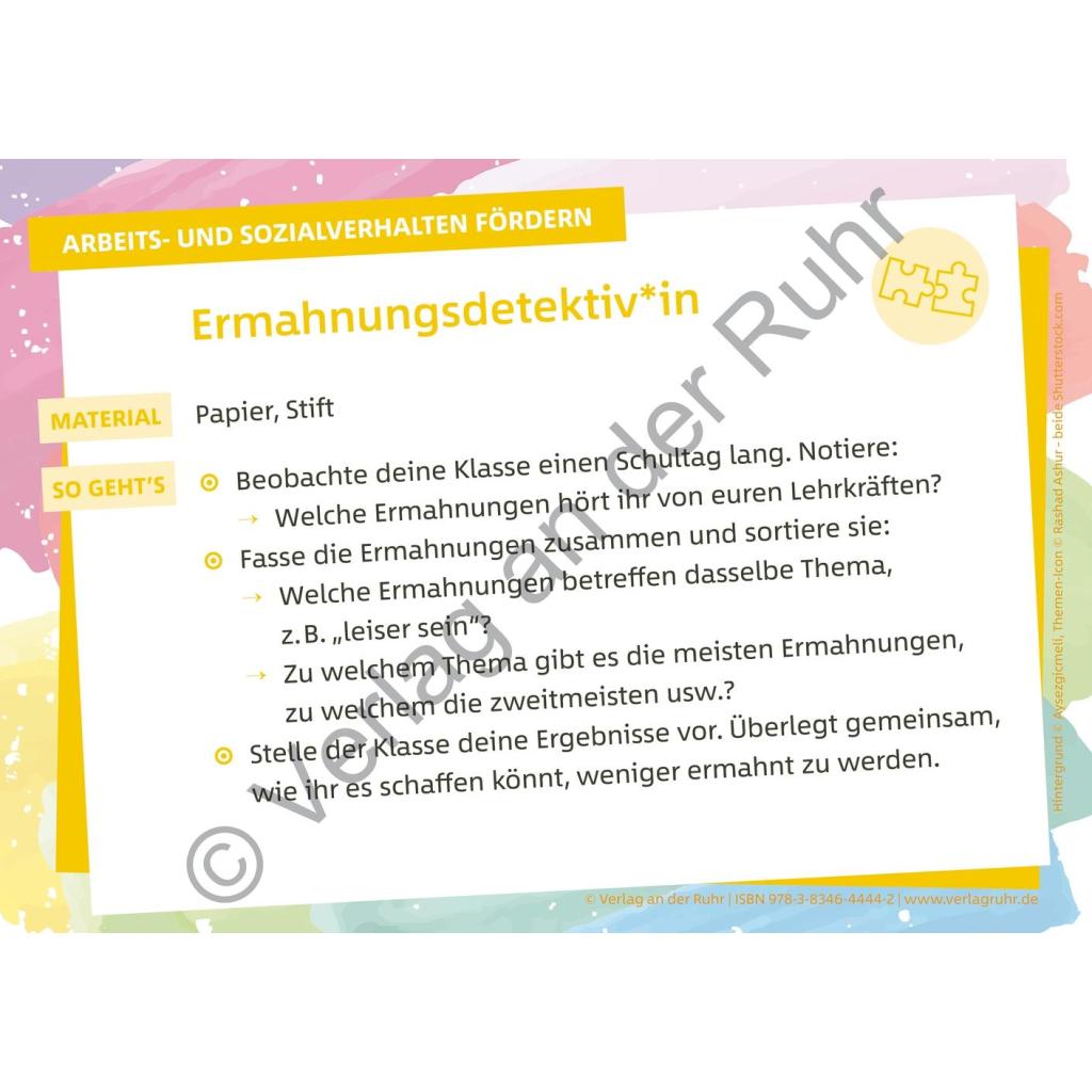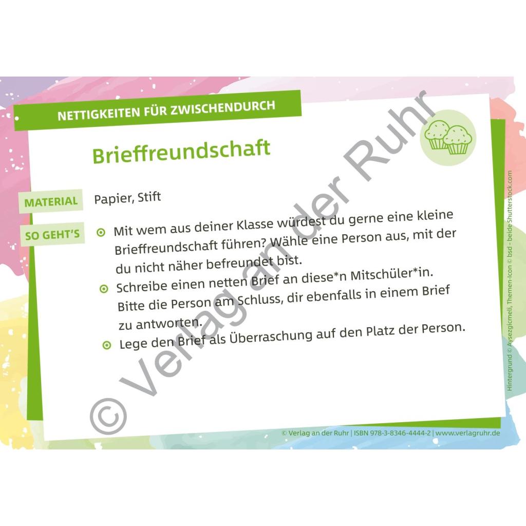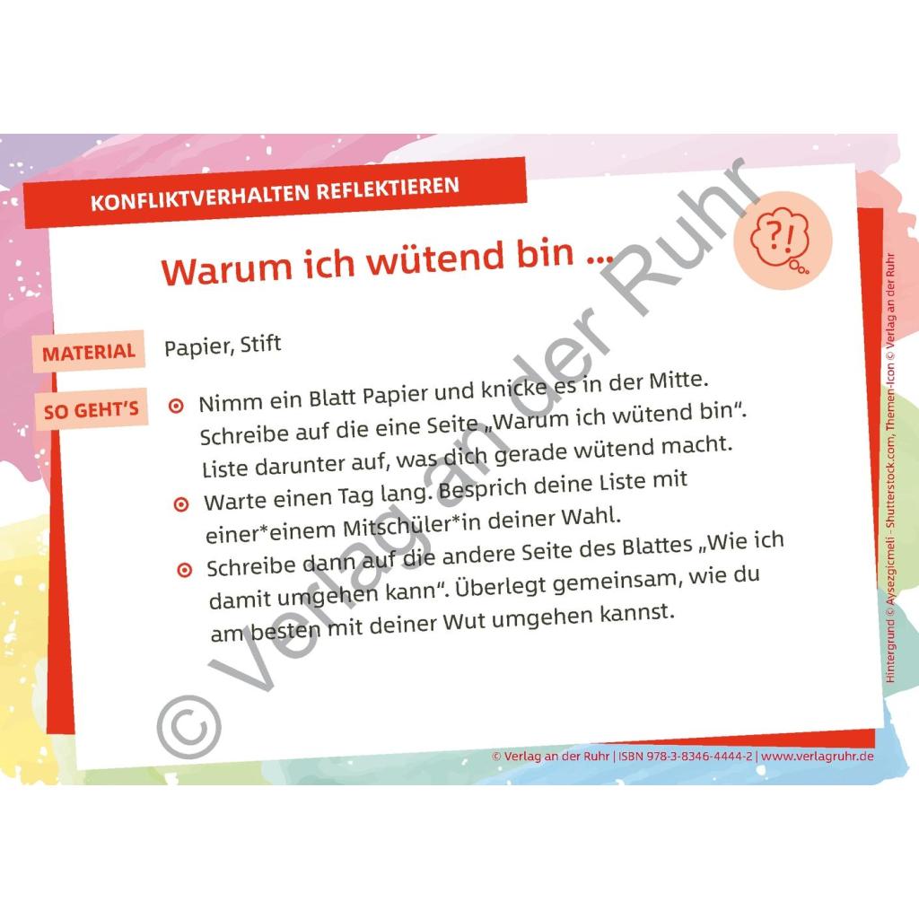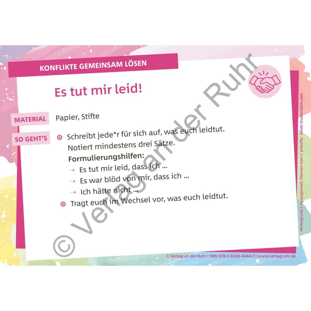 | Keyword: | Schüler; Ideensammlung; Klassenlehrer; Karteikarten; Arbeits- und Konfliktverhalten; freundliches Miteinander; um Verzeihung bitten; Konfliktlösefähigkeit; Streit lösen; sich entschuldigen; spielerisch; Unterricht; Unterrichtsmaterial; Klassengemeinschaft; konstruktiv; Schule; Lehrer |