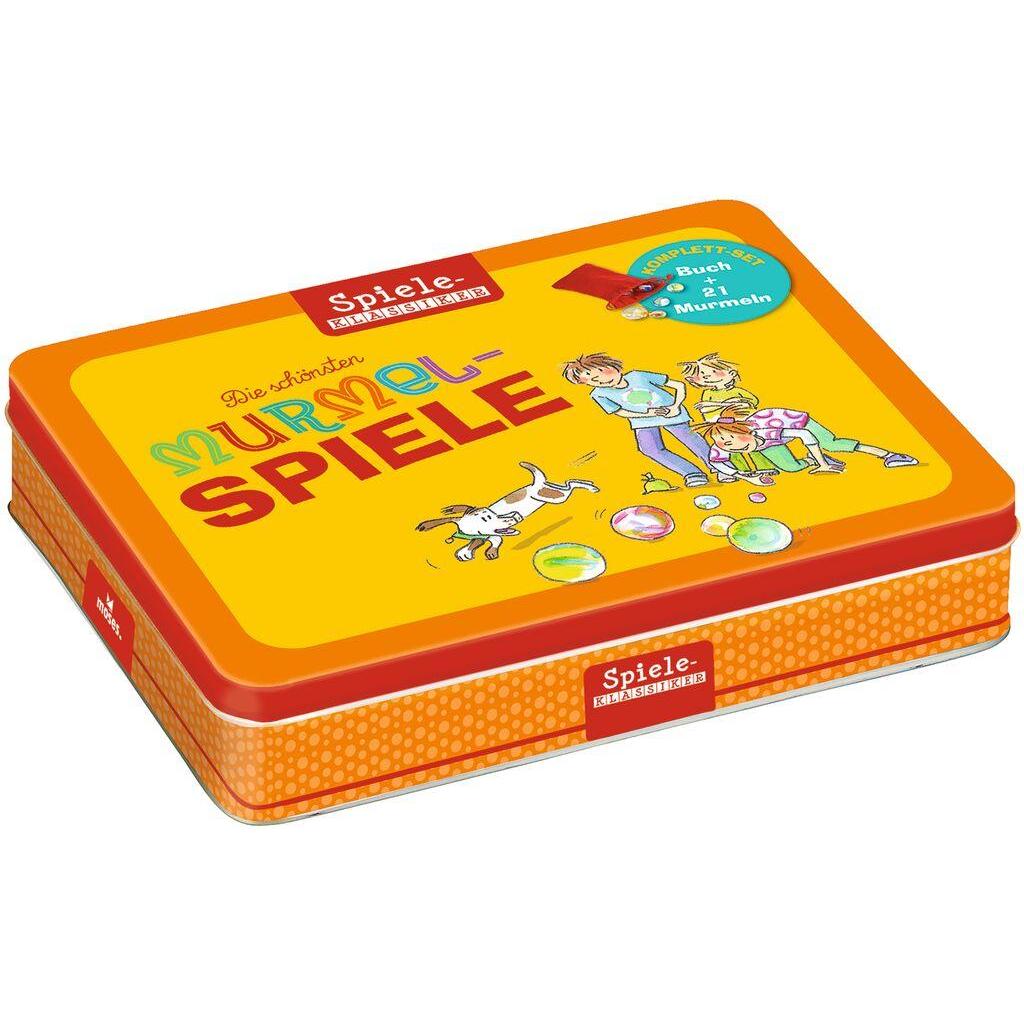 Murmel-Profis, aber auch Anfänger werden viel Spaß mit dieser Murmelspiel-Box haben. Neben den Klassikern gibt es auch viele neue lustige oder knifflige Spiele! Gespielt werden kann draußen in der Gruppe oder auch an langweiligen Regentagen allein im Kinderzimmer. Metalldose mit 72 seitigem Buch und Murmelsäckchen mit 21 Glasmurmeln