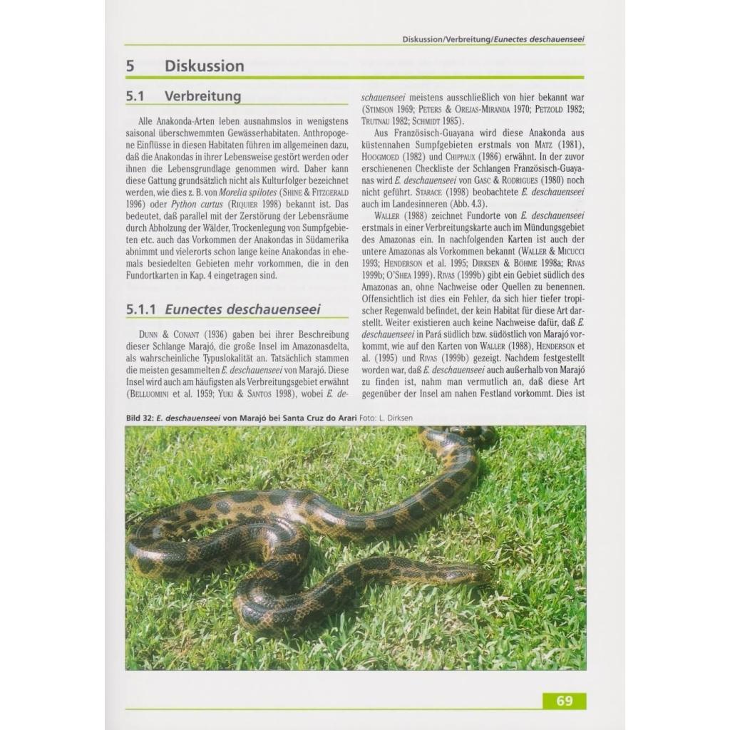 Mythos Anakonda: Um die spektakulären Riesenschlangen ranken sich von jeher Sagen und Legenden - das Publikum lauscht mit einer Mischung aus Faszination und Horror. Dr. Lutz Dirksen geht diesem Mythos auf den Grund und bietet neueste wissenschaftliche Erkenntnisse rund um die beeindruckenden Reptilien. Er beschreibt in diesem Buch sogar eine völlig neue, der Forschung bislang unbekannte Anakonda-Art! - Alle Fakten zu Lebensraum und Biologie - Gefährdete Riesen: Der Handel mit den Tieren - Neuste Erkenntnisse zur Systematik - Erstbeschreibung einer bislang unbekannten Anakonda-Art - Die größte Schlange der Welt - was ist dran am Mythos - Haltung und Zucht: So pflegt man Anakondas artgerecht - Faszinierende Farbfotos, entstanden auf abenteuerlichen Expeditionen Die riesigen Anakondas sind gut bekannte Schlangen - sollte man meinen. Aber weit gefehlt! Es ist erstaunlich, welch immense Wissenslücken es bei diesen spektakulären Großreptilien noch gibt. Weder die Frage nach der Maximallänge, noch nach dem genauen Verbreitungsgebiet war bislang befriedigend geklärt. Die Kenntnis der verwandtschaftlichen Verhältnisse zwischen den einzelnen Anakonda-Formen lag sogar ganz im Argen - Art- und Unterartbeschreibungen erwiesen sich als unpräzise, vermeintliche Unterscheidungsmerkmale als unzutreffend. Für den Forscher Lutz Dirksen eine echte Überraschung, als er bei seinen intensiven Literaturrecherchen auf all diese Unstimmigkeiten stieß und feststellen musste, dass noch längst nicht alle Rätsel um die faszinierenden Riesenschlangen gelöst waren. Daraufhin begann er mit weiteren Nachforschungen: Er sichtete und überprüfte die Veröffentlichungen zum Thema, untersuchte das konservierte Material in wissenschaftlichen Sammlungen auf drei Kontinenten, arbeitete mit modernsten Labormethoden zur Aufklärung genetischer Fragen und nicht zuletzt spürte er den Riesenschlangen auf zahlreichen Forschungsreisen in ihren natürlichen Lebensräumen, den Sümpfen Brasiliens, Ecuadors, Boliviens, Paraguays und Argentiniens nach. Dirksens Ergebnisse sind spektakulär und erregten bereits viel Aufsehen. So war er zu Gast bei Günther Jauchs "stern TV" sowie bei verschiedenen anderen Fernsehsendungen, und zwei seiner Expeditionen wurden von Kamera-Teams begleitet. In diesem Buch stellt Dirksen nun alle Erkenntnisse vor, die er seit 1994 akribisch zusammengetragen hat. So bietet er erstmals präzise Verbreitungskarten für alle Länder, in denen die Riesenschlangen vorkommen, und widmet sich ausführlich der Beantwortung der Frage nach der längsten Schlange der Welt. Auch die Systematik der Gattung Eunectes wird ein ganzes Stück klarer: Dirksen bringt nicht nur Ordnung in das bisherige Arten- und Unterartenwirrwarr, sondern es gelang ihm sogar, in den Überschwemmungsgebieten Boliviens eine neue Anakonda-Art zu entdecken, die in diesem Buch erstmals wissenschaftlich beschrieben und benannt wird. Aber auch viele andere Aspekte werden besprochen, von der Fortpflanzungsbiologie über die Terrarienhaltung bis zum Handel und der Gefährdung der Anakondas. Die prachtvolle Ausstattung und das reichhaltige Bildmaterial machen den vorliegenden Band zur unentbehrlichen Lektüre für jeden Schlangenfreund und alle, die dem "Mythos Anakonda" gerne auf den Grund gehen möchten!