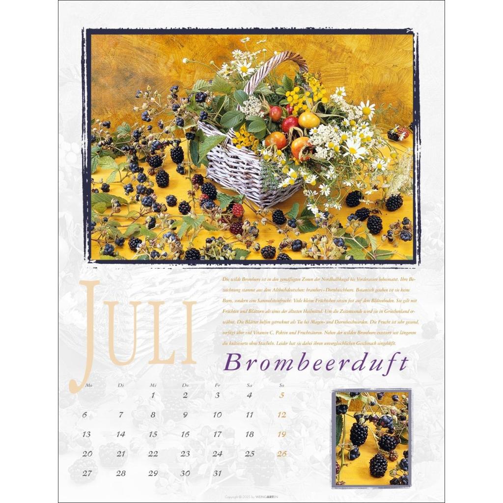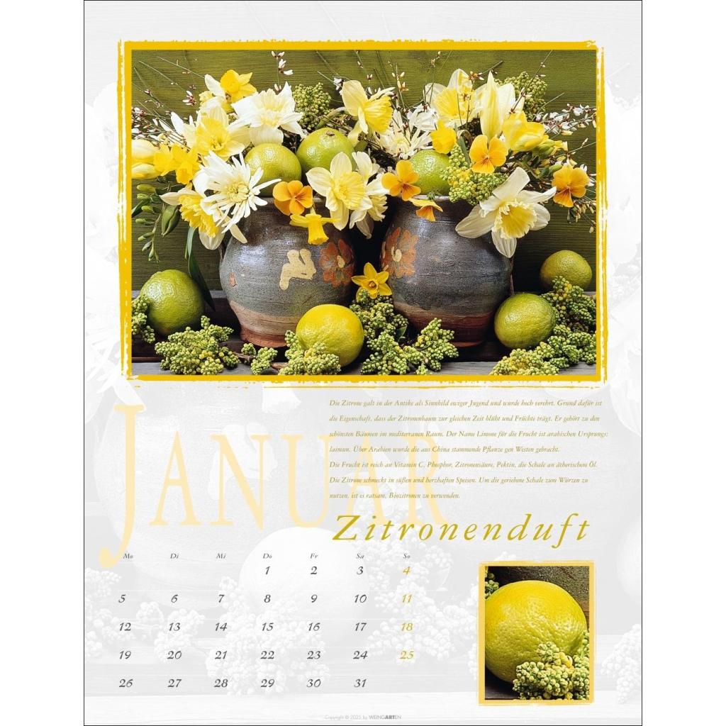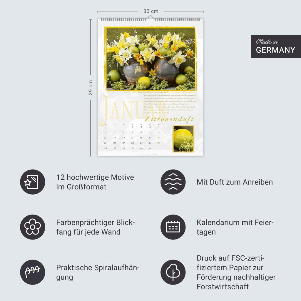 Hochwertiger Wandkalender mit zauberhaften Blumen-, Kräuter- und Früchtearrangements und wissenswerten Informationen. Besonderer Kalender mit zarten Düften. 30x39 cm