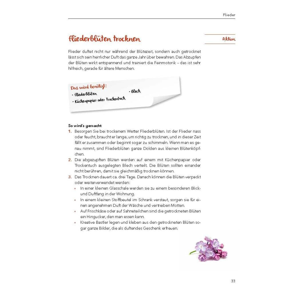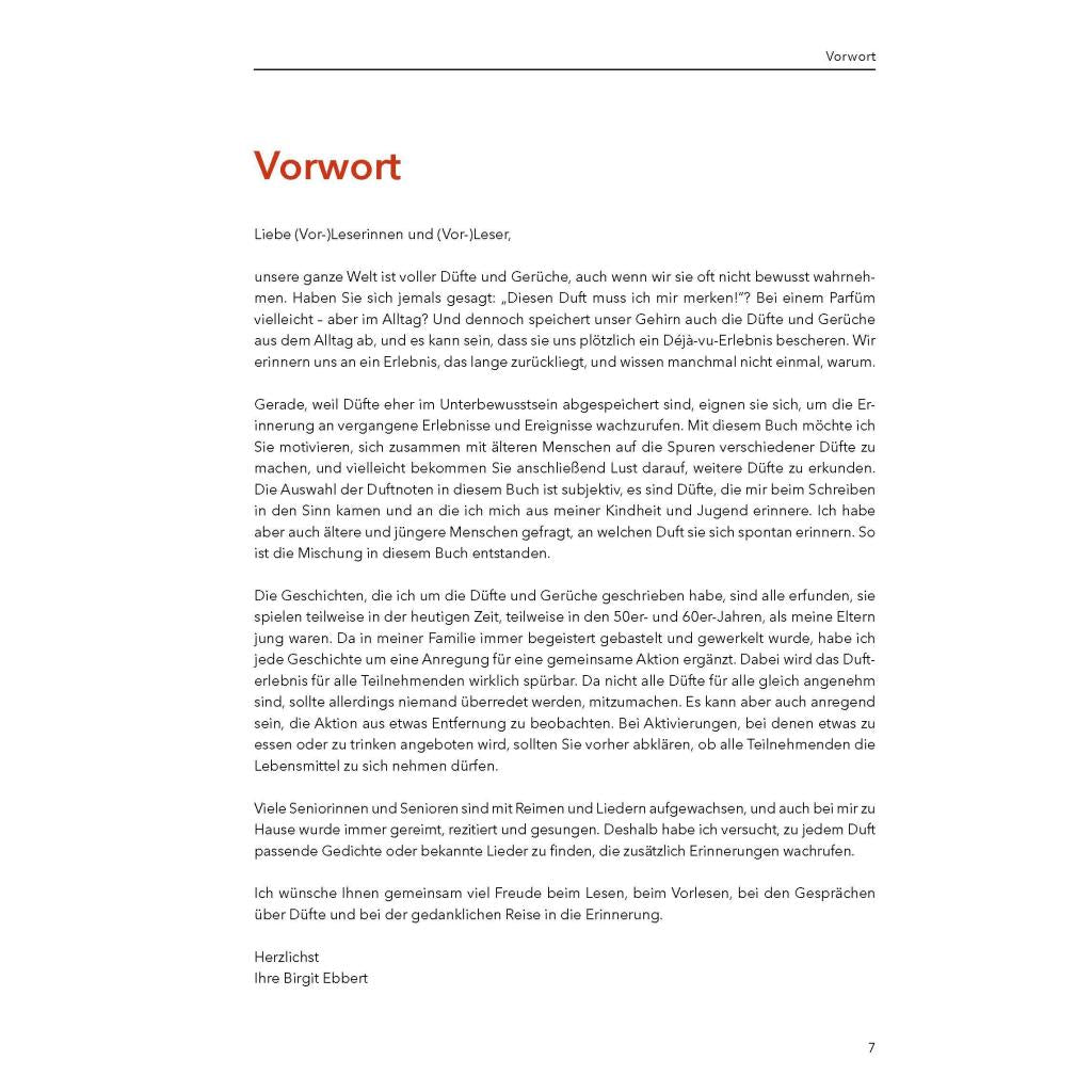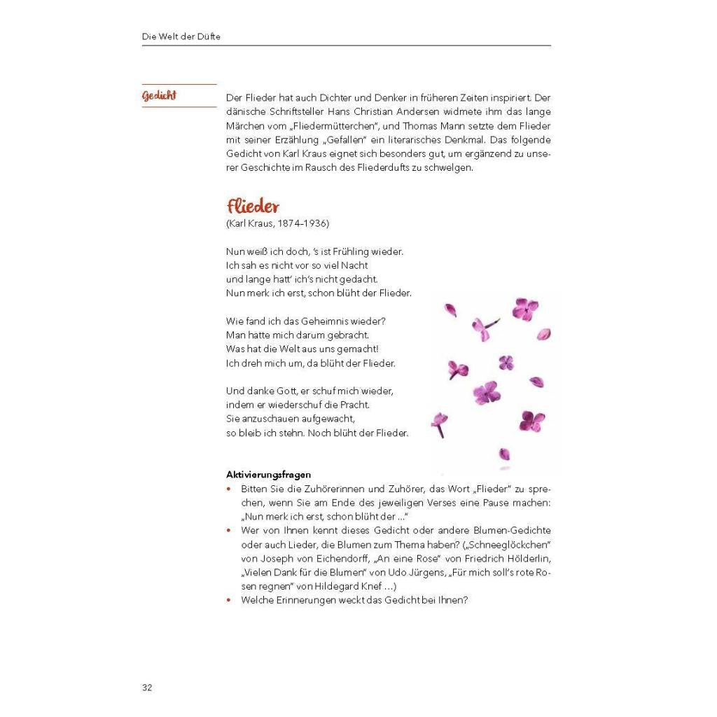 Die Welt der Düfte - Geschichten und Aktivierungen für Senioren Mit Duftgeschichten an Erlebtes erinnern - mit Aktivierungen die Sinne anregen Mit Düften werden Erinnerungen wach - würzige Tannennadeln und süßlicher Harz lassen längst vergessene Waldspaziergänge wieder aufl eben, zart riechende Maiglöckchen wecken die Gedanken an einen geliebten Menschen und beim süß-säuerlichen Geruch eines frischen Apfelkuchens fallen einem vielleicht die Nachmittage in Großmutters Küche ein. Deshalb eignen sich Geschichten, Beschäftigungs- und Aktivierungsangebote rund um Düfte , Gerüche und Aromen besonders gut für die Arbeit mit Seniorinnen und Senioren - mit und ohne Demenz. Tauchen Sie mit diesem Buch in die Welt der Düfte ein. Wecken Sie mit den Geschichten und Aktivierungen, mit kleinen Back- und Bastelaktionen u.v.m. die Neugierde und regen Sie alle Sinne an. Die Vorlese- und Aktivierungsstunden können einfach und ohne lange Vorbereitungszeit durchgeführt werden.