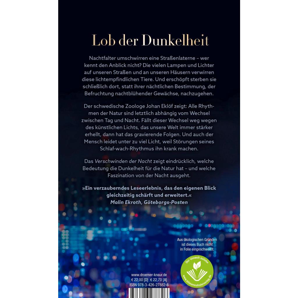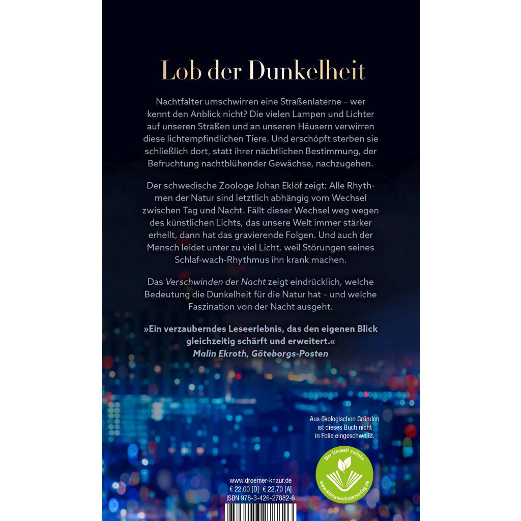 | Keyword: | Abenteuerlust Natur; Artenschutz; Bio-Rhythmus; Biodiversität; Das Evangelium der Aale; Die Letzten ihrer Art; Dunkelheit; Entdeckung der Nacht; Faszination Natur; Fledermaus; Fledermäuse; Helligkeit; Insekten; Klimawandel; Kunstlicht; Licht; Lichtemission; Lichtsmog; Lichtverschmutzung; Lichtverunreinigung; Mensch und Natur; Mensch und Tier; Nacht; Nachtaktive Tiere; Nachtwanderung; Nature Writing; Naturforscher; Naturgeschichte; Naturkunde; Naturschutz; Naturwissenschaften; Patrik Svensson; Rachel Carson; Schlaf-Wach-Rhythmus; Schlafstörung; Schweden; Sternenhimmel; Systemökologe; Systemökologie; Tag und Nacht; Tag-Nacht-Rhythmus; Umwelt; Umweltschutz; Vögel; Wildtiere |