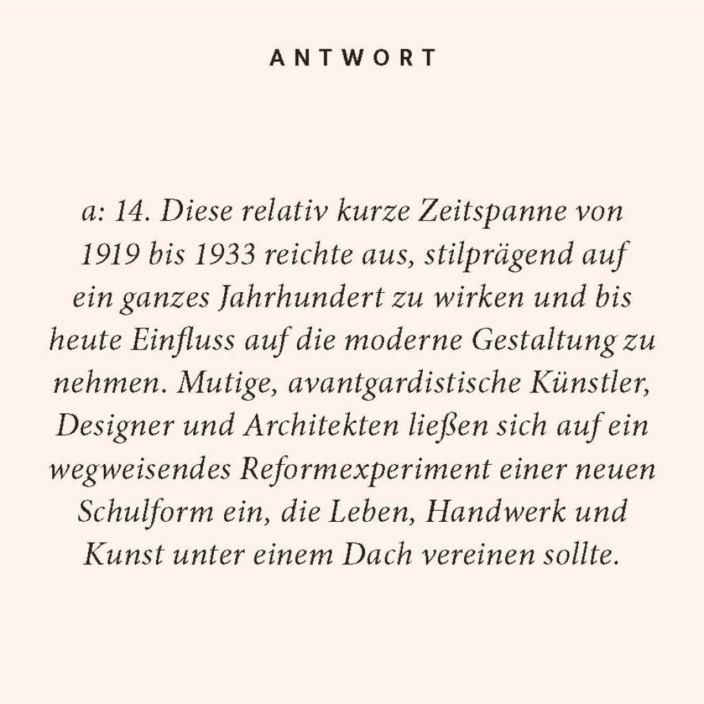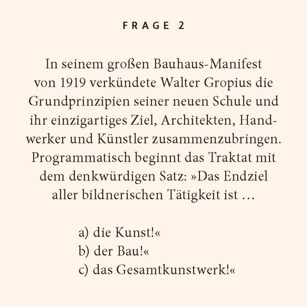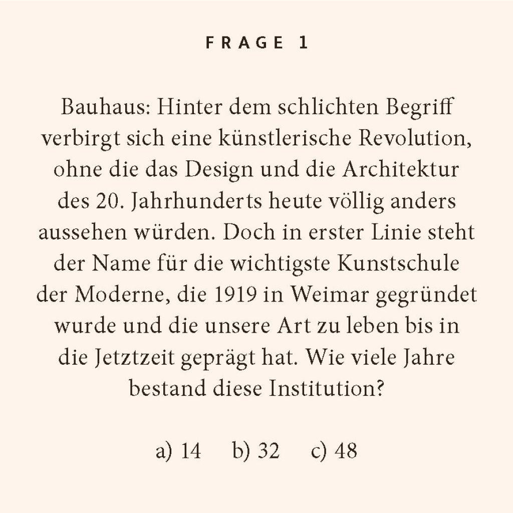 | Keyword: | Architektur; Bauhaus; Design; Epoche; Quiz; Ratespiel; Spiel; Stilrichtung; Themen-Quiz; Weimar; form follows function |