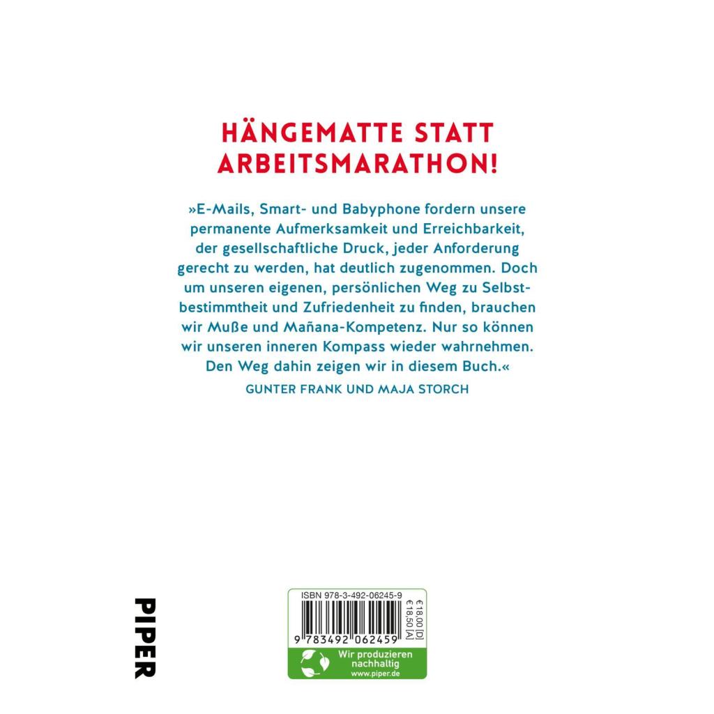 Hängematte statt Arbeitsmarathon! 'E-Mails, Smart- und Babyphone fordern unsere permanente Aufmerksamkeit und Erreichbarkeit, der gesellschaftliche Druck, jeder Anforderung gerecht zu werden, hat deutlich zugenommen. Doch um unseren eigenen, persönlichen Weg zu Selbstbestimmtheit und Zufriedenheit zu finden, brauchen wir Muße und Mañana-Kompetenz. Nur so können wir unseren inneren Kompass wieder wahrnehmen. Den Weg dahin zeigen wir in diesem Buch.' Gunter Frank und Maja Storch