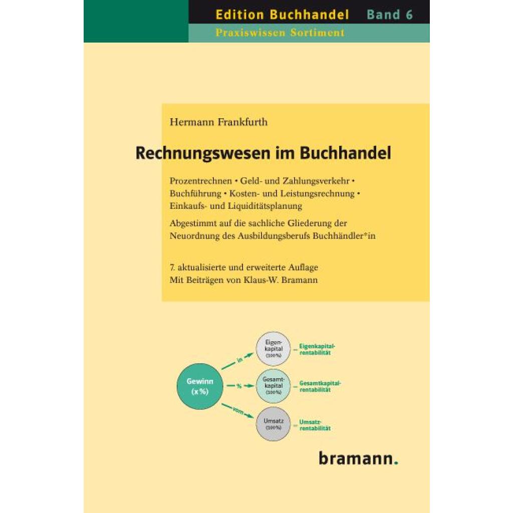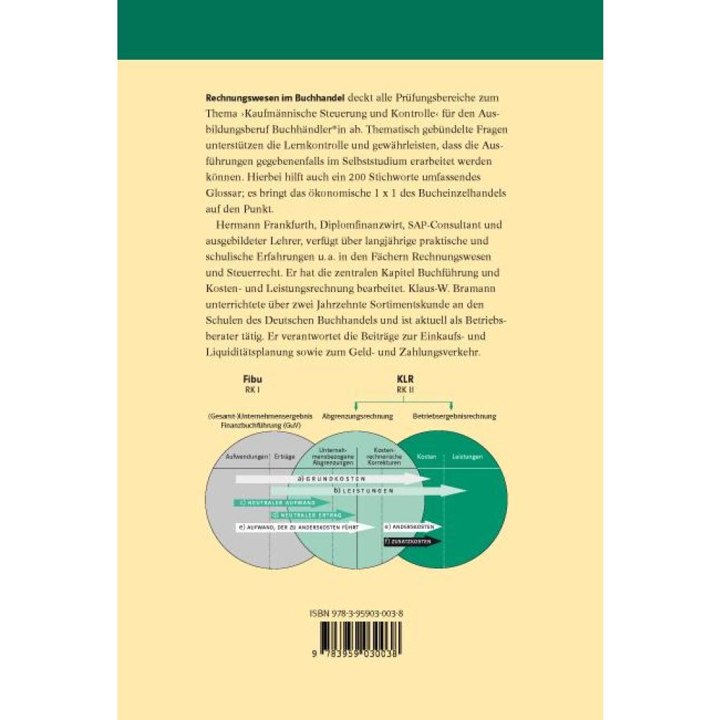 Rechnungswesen im Buchhandel deckt alle Prüfungsbereiche zum Thema ¿Kaufmännische Steuerung und Kontrolle¿ für den Ausbildungsberuf Buchhändler*in ab. Thematisch gebündelte Fragen unterstützen die Lernkontrolle und gewährleisten, dass die Ausführungen gegebenenfalls im Selbststudium erarbeitet werden können. Hierbei hilft auch ein 200 Stichworte umfassendes Glossar; es bringt das ökonomische 1 x 1 des Bucheinzelhandels auf den Punkt. Hermann Frankfurth, Diplomfinanzwirt, SAP-Consultant und ausgebildeter Lehrer, verfügt über langjährige praktische und schulische Erfahrungen u.¿a. in den Fächern Rechnungswesen und Steuerrecht. Er hat die zentralen Kapitel Buchführung und Kosten- und Leistungsrechnung bearbeitet. Klaus-W. Bramann unterrichtete über zwei Jahrzehnte Sortimentskunde an den Schulen des Deutschen Buchhandels und ist aktuell als Betriebsberater tätig. Er verantwortet die Beiträge zur Einkaufs- und Liquiditätsplanung sowie zum Geld- und Zahlungsverkehr.