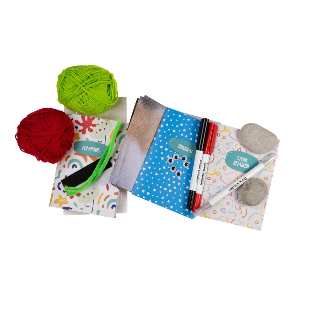 Hurra, es sind Ferien! Die erste Ferien-Beschäftigungs-Box machen deine Sommerferien zu einem kreativen Zeitvertreib . Mit einer Auswahl von kreativen Aktivitäten für ganze sechs Wochen, vergehen die Ferien wie im Flug. Hier kommt keine Langeweile auf - Versprochen! Jede Woche eine neue Kreativtechnik: Von Zeichnen über Makramee, Origami, Pompons bis hin zum Steine bemalen und Freundschaftsbänder knüpfen - die Box bietet eine breite Palette von Kreativtechniken, die du während deiner Ferien ausprobieren kannst. Anleitungen und Materialien: Jede Box enthält ein Anleitungsbuch und alle notwendigen Materialien, um die Projekte reibungslos umsetzen zu können. Es werden nur noch haushaltsübliche Gegenstände benötigt. Was genau, findest du hinter dem QR-Code auf der Verpackung. Urlaubstauglich: Steht ein Familienausflug an? Kein Problem! Die Schachteln sind handlich und können problemlos mit in den Urlaub genommen werden. Damit können die kreativen Aktivitäten auch an den schönsten Orten fortgesetzt werden. Mitmachseiten im Anleitungsbuch: Neben den Kreativtechniken enthält jedes Anleitungsbuch auch Mitmachseiten mit tollen Rätseln und Ausmalbildern für zwischendurch. Das erwartet dich: 6 Mitmachbücher mit 32 Seiten Knüpfgarn in 3 Farben (je 8 m; 100 % Baumwolle) 3 Bleistifte (H, HB und B) Radiergummi Zeichenblock (DIN A6, 24 Blatt) Makramee-Garn (15 m, 60 % Baumwolle, 40 % Polyester) 2 Garnknäule (je 20 g, 100 % Polyester) Filz in Schwarz und Weiß (100 % Polyester) 30 Faltpapiere 10 Wackelaugen 3 Acrylmarker 3 Natursteine