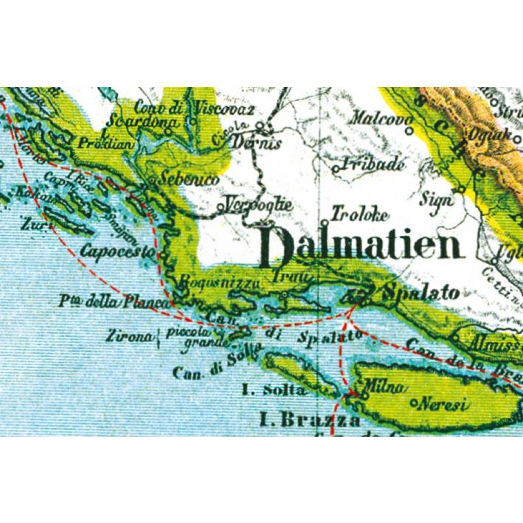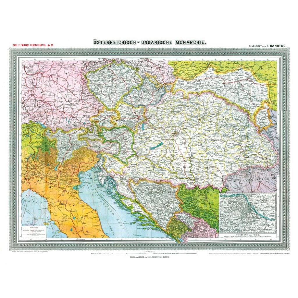 General-Karte der ÖSTERREICHISCH-UNGARISCHE MONARCHIE 1867-1918, um 1908. Carl Flemmings Generalkarten No. 22. Nachdruck, Außenformat (Breite x Höhe) 88 x 68 cm - Darstellungsgröße (Breite x Höhe) 84 x 65 cm. Grenz-und flächenkolorierte Karte. Kartograph: Friedrich Handtke (1815-1879). [Lieferung in einer sehr stabilen Pappversandhülse - bis 72 cm lang - 250 g] Maßstab 1: 1.900.000 Carl Flemming Verlag Glogau, Buch- u. Kunstdruckerei, A.G., Berlin u. Glogau. ohne Jahr (ca. 1908). Zeigt das Gebiet der Österreichisch-Ungarische Monarchie, die 1867 entstand. - Die Karte zeigt Österreich, Ungarn, Tschechien, Slowakei, Slowenien, Kroatien, Bosnien und Herzegowina, Siebenbürgen und Banat, Montenegro, Ukraine, Rumänien mit Bukowina undTirol. Über der Karte Titelkopfleiste. Unten links Erklärungen. Unten rechts Insetkarte von Wien und Umgebung. Die Karte mit Einzeichnungen von Eisenbahnlinien. Rußland einschl. Polen und Finnland; Schweden; Norwegen; Östreichisch-Ungarische Monrachie mit Bosnien und Herzegowina, Deutsches Reich; Frankreich; Spanien; Großbritannien und Irland mit Gibraltar und Malta; Italien; Eropäische Türkei; Albanien; Bulgarien Athos (autonom); Rumänien; Portugal einschl. Azoren und Madeira; Griechenland; Serbien; Schweiz; Dänemark mit den Färöer und Island; Niederlande; Luxemburg; Belgien; Montenegro; Andorra; Liechtenstein; San Marino und Monaco.