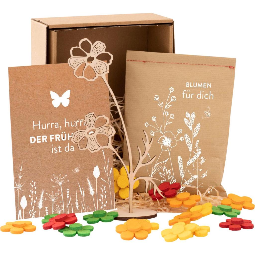 Geschenkebox mit Jahreszeiten-Deko | Das beste Frühlings-Geschenk: Set mit Deko-Blume aus Holz, Wildblumen-Samen uvm.