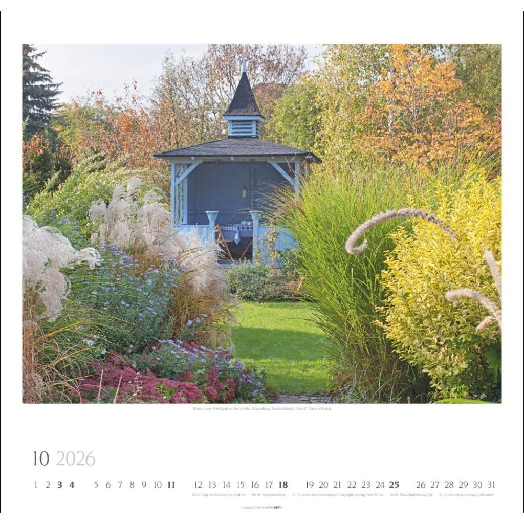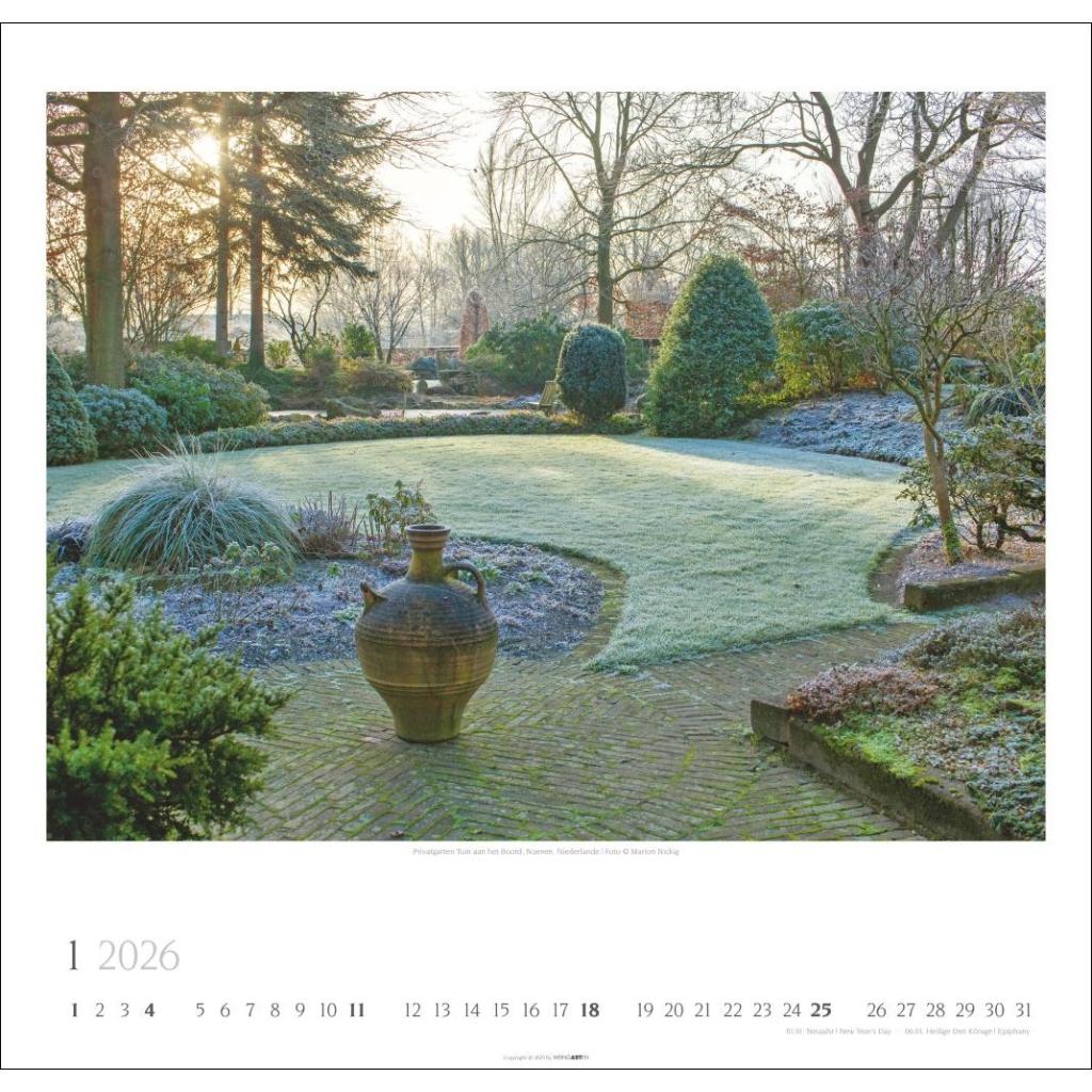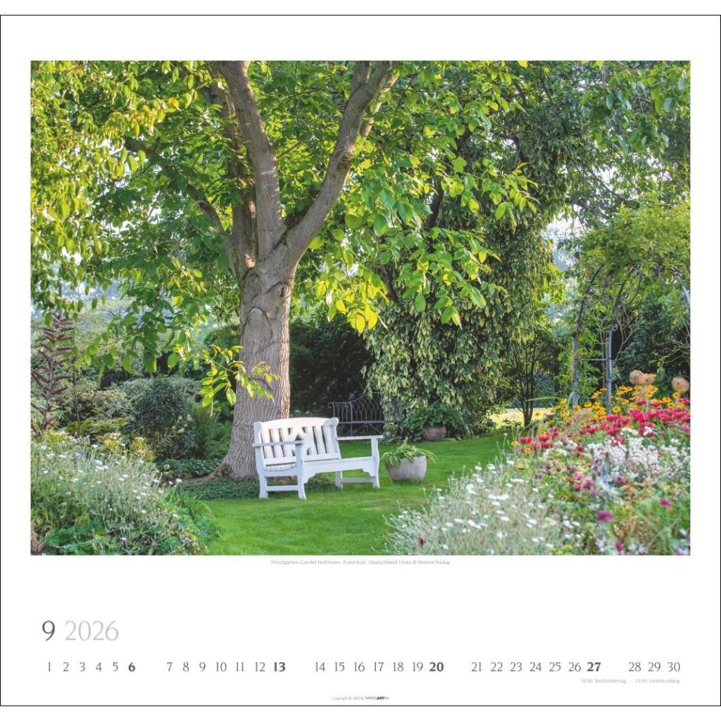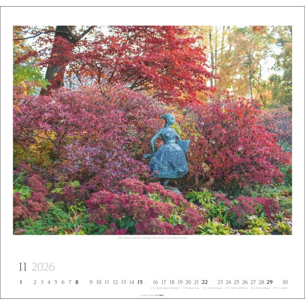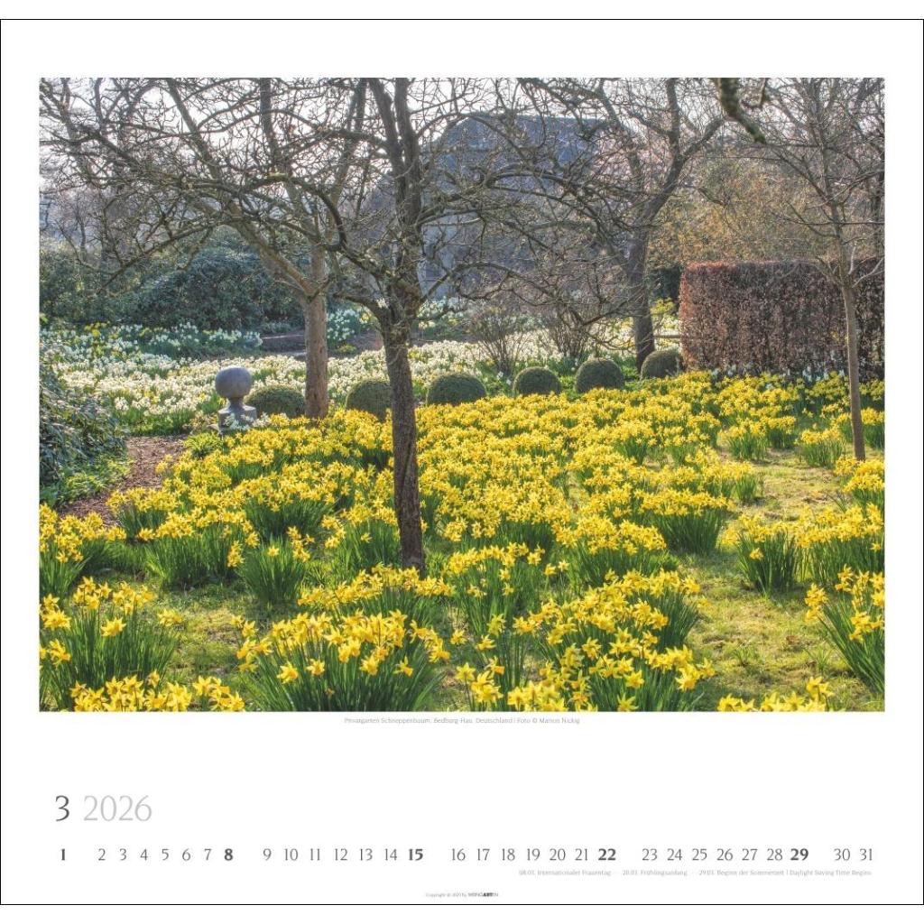 Wandkalender mit 12 Fotos romantischer Gärten. Farbenprächtiger Bildkalender für die Wand. Quadratischer Fotokalender.