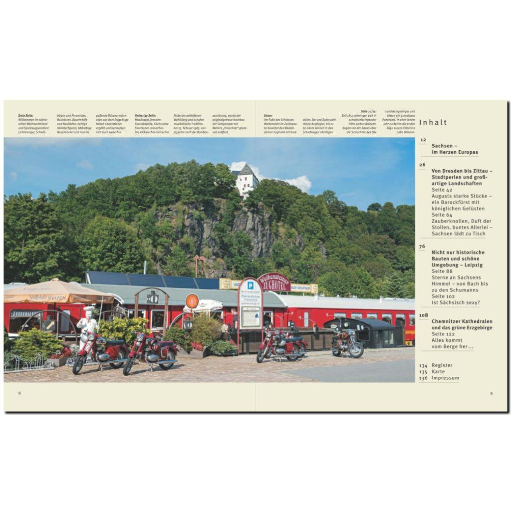 Im Erzgebirge liegt der höchste Punkt Sachsens, der Fichtelberg, im Elbsandsteingebirge beeindrucken die markanten steilen Felswände, durch das liebliche Elbtal führt die Sächsische Weinstraße, romantische Flusstäler bieten Mulde und Zschopau. Die Metallfunde des Erzgebirges ermöglichten eine reiche Kunstentfaltung. Glänzen in Dresden, dem "Elbflorenz", der Zwinger, Schloss, katholische Hofkirche und Semperoper, ist Leipzig die Stadt des Handels mit ehemaligen Messehäusern und Handelshöfen samt Passagen. Berühmt ist die Mädlerpassage mit "Auerbachs Keller". Chemnitz Kathedralen sind keine Sakralbauten, sondern großartige Denkmale der Industriearchitektur aus der Gründerzeit. REISE DURCH ... ist eine Bildband-Reihe professionell fotografiert von renommierten Reisefotografen - - - Bis zu 230 Bilder auf 128 bis 140 Seiten - - - Sensationell günstiger Preis - - - Alle wichtigen Sehenswürdigkeiten - - - Kultur und Traditionen - - - Kenntnisreiche Texte - - - Ausführliche Bildunterschriften - - - Farbige Übersichtskarte - - - Detailliertes Register. - Dieser Band ist auch in englischer Sprache lieferbar!