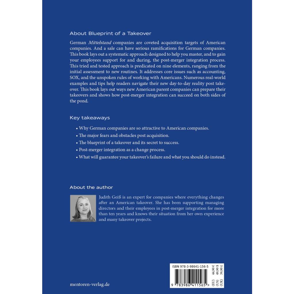 About Blueprint of a Takeover German Mittelstand companies are coveted acquisition targets of American companies. And a sale can have serious ramifications for German companies. This book lays out a systematic approach designed to help you master, and to gain your employees support for and during, the post-merger integration process. This tried and tested approach is predicated on nine elements, ranging from the initial assessment to new routines. It addresses core issues such as accounting, SOX, and the unspoken rules of working with Americans. Numerous real-word examples and tips help readers navigate their new day-to-day reality post takeover. This book lays out ways new American parent companies can prepare their takeovers and shows how post-merger integration can succeed on both sides of the pond. Key takeaways Why German companies are so attractive to American companies. The major fears and obstacles post acquisition. The blueprint of a takeover and its secret to success. Post-merger integration as a change process. What will guarantee your takeover's failure and what you should do instead.