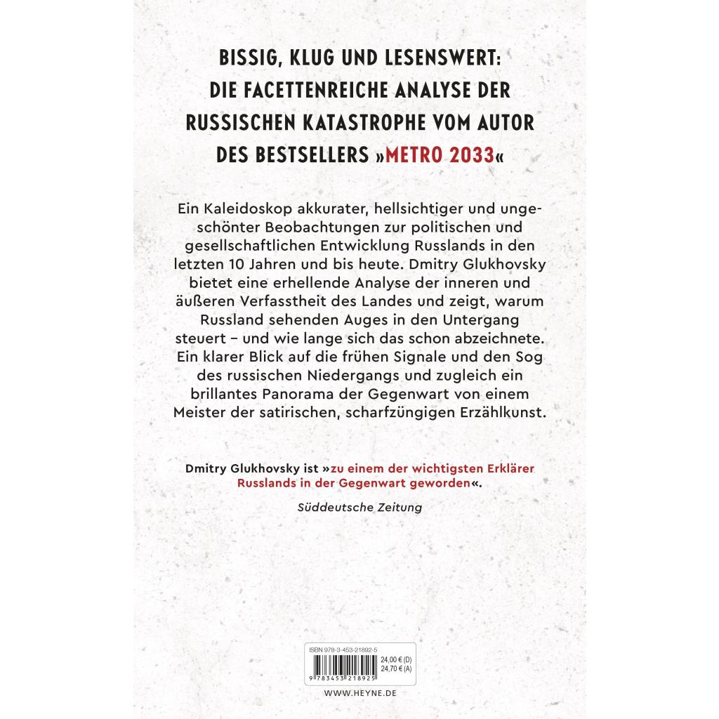Ein Kaleidoskop voller akkurater, hellsichtiger und ungeschönter Beobachtungen des Bestsellerautors zur politischen und gesellschaftlichen Entwicklung Russlands während der letzten 10 Jahre bis heute. Glukhovskys scharfer Blick auf die Ereignisse bietet eine erhellende Analyse der inneren und äußeren Verfasstheit des Landes und zeigt, warum Russland sehenden Auges in den Untergang steuert - und wie lange sich das schon abzeichnete. Ein klarer Blick auf die frühen Signale und den Sog des russischen Niedergangs und zugleich ein brillantes Panorama der Gegenwart von einem Meister der satirischen, scharfzüngigen Erzählkunst.