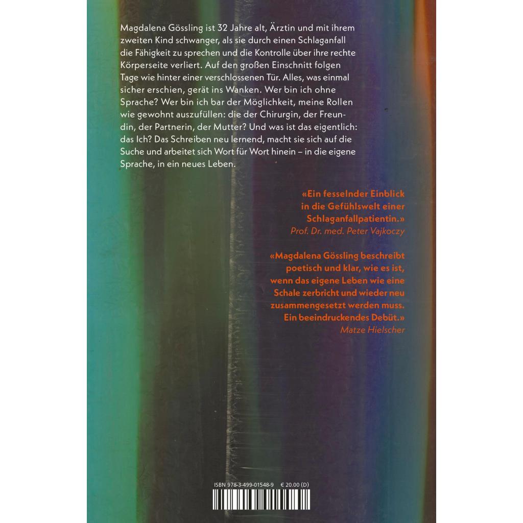 | Keyword: | Daniel Schreiber; Die Sprache wiederfinden; Gabriele von Arnim; Krankheit; Schicksalsschlag; Schlaganfall Bericht; Selbstfindung; Sprachphilosophie; Sprachverlust; Umgehen mit Krankheit; Verlust; junge Mutter |
