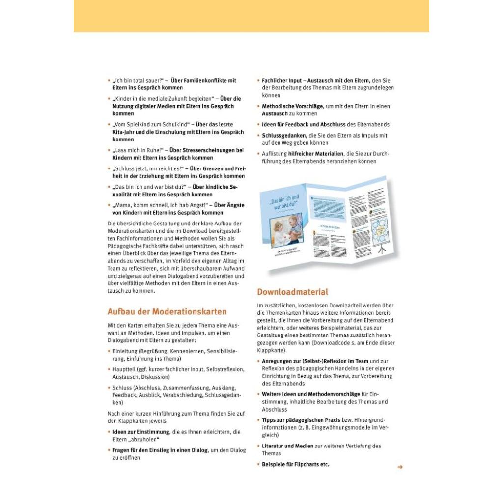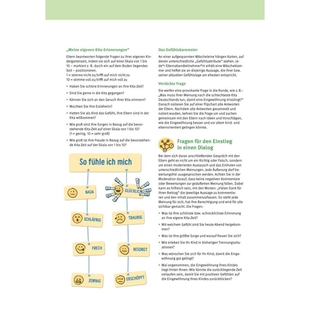 | Keyword: | eingewöhnung kita; elternabend; elternarbeit; elternberatung; elterngespräch; erziehungspartnerschaft; moderationskarten; partizipation im kindergarten; schulfähigkeit; ängste bei kindern |