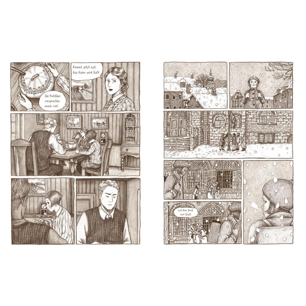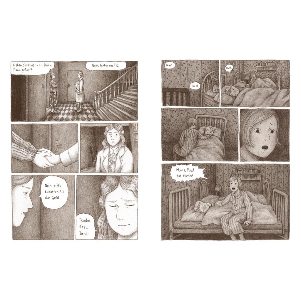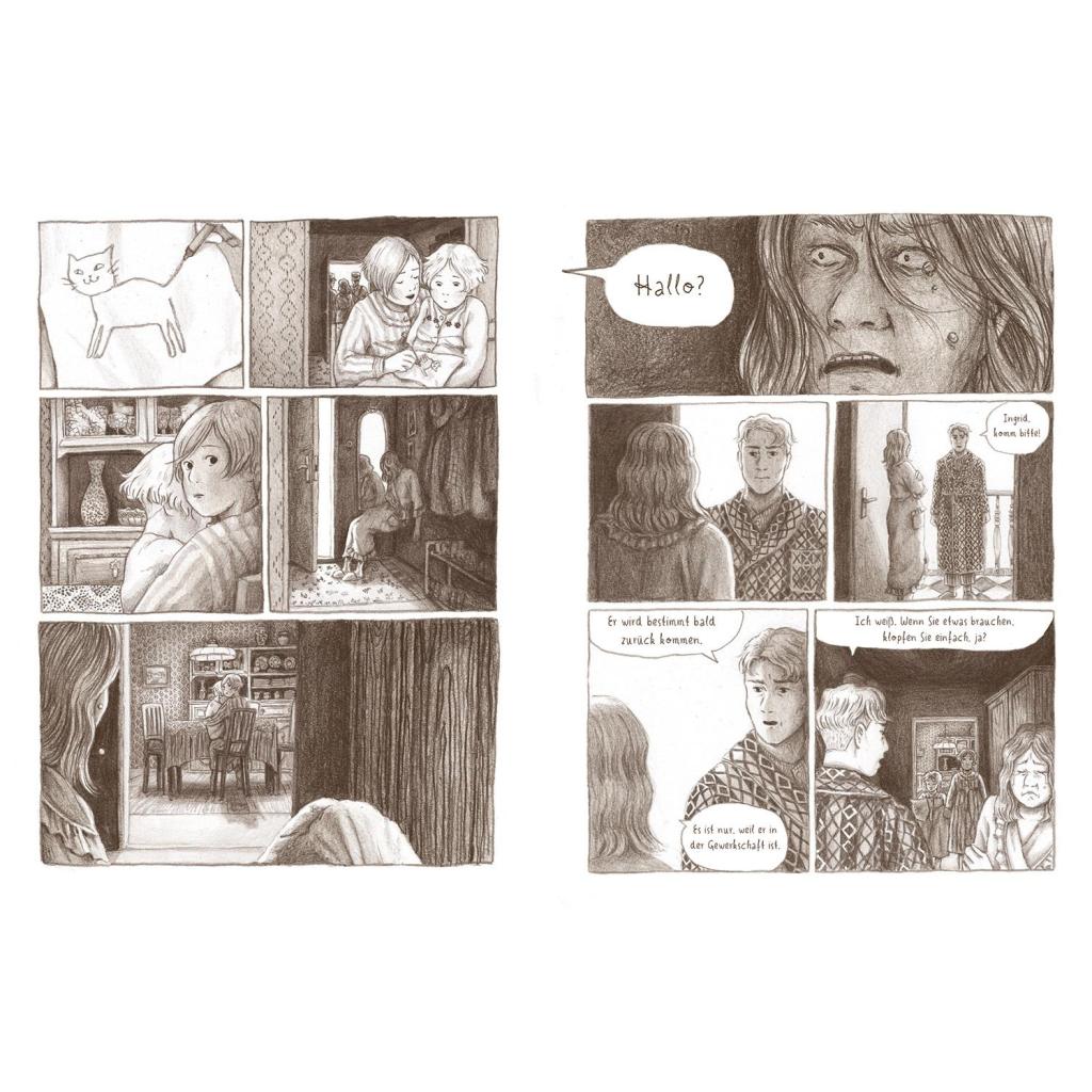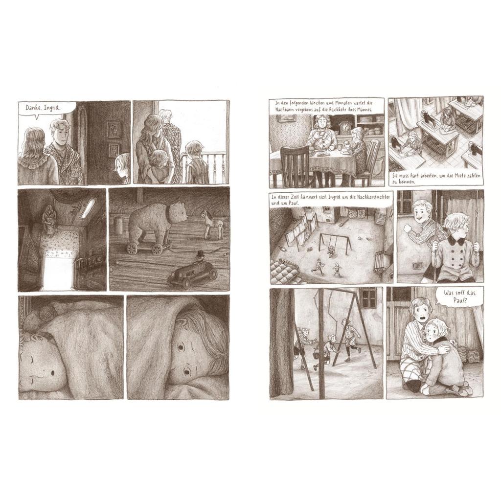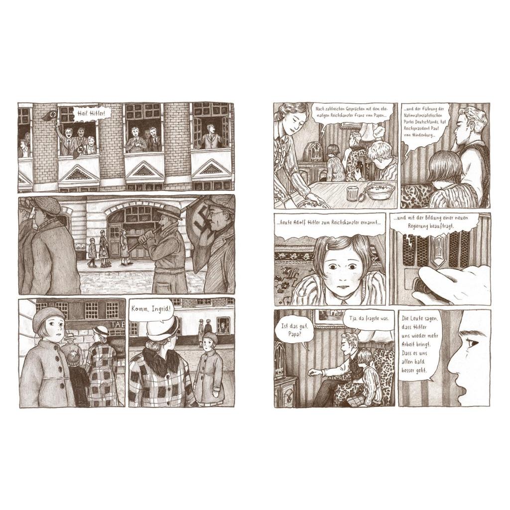 Wie widerstandsfähig können Heranwachsende sein, wenn die Ideologie, die sie umgibt, menschenverachtend ist? Die Graphic Novel Ingrid und Paul beschäftigt sich mit dieser Frage. Sie erzählt die Geschichte zweier Geschwister, die in der NS-Zeit ihre Identität zwischen Gewissen und Gesinnung suchen. Sie werden erbitterte Gegner, finden jedoch im Widerstand als junge Erwachsene wieder zusammen. Die 13 Episoden, jede in einem Jahr zwischen 1933 und 1945 angesiedelt, geben Einblicke in den Alltag dieser Zeit. Sie zeigen, wie die Geschwister unter dem Druck der Ideologie heranwachsen. Die Geschichte bleibt emotional auf ihre Beziehung fokussiert, beleuchtet jedoch gleichzeitig viele verschiedene Aspekte dieser düsteren Epoche. Die Ästhetik der Graphic Novel ist klassisch und naturalistisch, mit analog gezeichneten Bleistiftzeichnungen, die eine beklemmende Atmosphäre schaffen. Die monochrome Farbgebung erinnert an alte Fotos und unterstreicht die Wärme des vertrauten Zuhauses, das den Kindern genommen wird. Mit der Zeit spiegelt der Zeichenstil zunehmend das klaustrophobische Gefühl der Diktatur wider.
