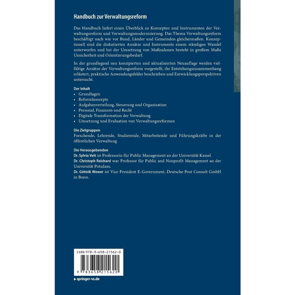 Das Handbuch liefert einen Überblick zu Konzepten und Instrumenten der Verwaltungsreform und Verwaltungsmodernisierung. Das Thema Verwaltungsreform beschäftigt nach wie vor Bund, Länder und Gemeinden gleichermaßen. Konzeptionell sind die diskutierten Ansätze und Instrumente einem ständigen Wandel unterworfen und bei der Umsetzung von Maßnahmen besteht in großem Maße Unsicherheit und Orientierungsbedarf. In der grundlegend neu konzipierten und aktualisierten Neuauflage werden vielfältige Ansätze der Verwaltungsreform vorgestellt, ihr Entstehungszusammenhang erläutert, praktische Anwendungsfelder beschrieben und Entwicklungsperspektiven untersucht.