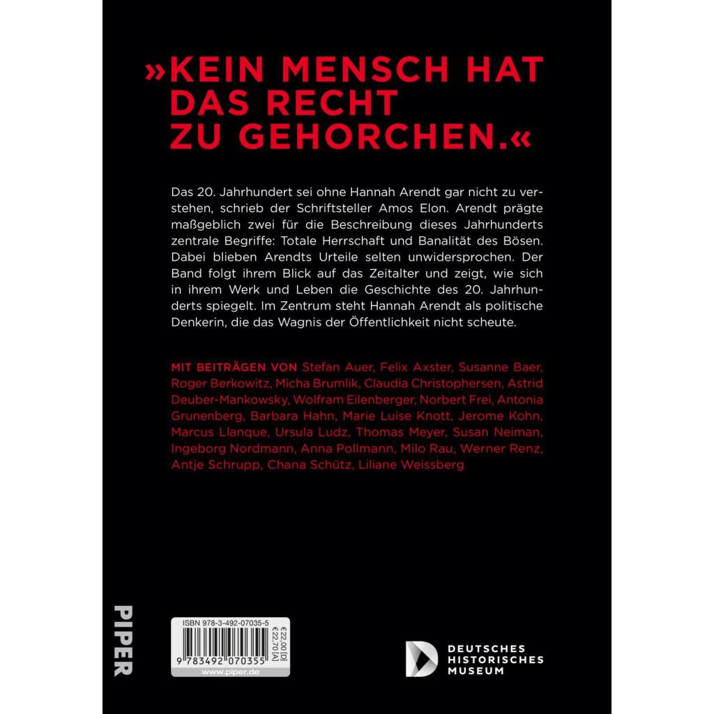 »Kein Mensch hat das Recht zu gehorchen.« Das 20. Jahrhundert sei ohne Hannah Arendt gar nicht zu verstehen, schrieb der Schriftsteller Amos Elon. Arendt prägte maßgeblich zwei für die Beschreibung dieses Jahrhunderts zentrale Begriffe: Totale Herrschaft und Banalität des Bösen. Dabei blieben Arendts Urteile selten unwidersprochen. Der Band folgt ihrem Blick auf das Zeitalter und zeigt, wie sich in ihrem Werk und Leben die Geschichte des 20. Jahrhunderts spiegelt. Im Zentrum steht Hannah Arendt als politische Denkerin, die das Wagnis der Öffentlichkeit nicht scheute. Mit Beiträgen von Stefan Auer, Felix Axster, Susanne Baer, Roger Berkowitz, Micha Brumlik, Claudia Christophersen, Astrid Deuber-Mankowsky, Wolfram Eilenberger, Norbert Frei, Antonia Grunenberg, Barbara Hahn, Marie Luise Knott, Jerome Kohn, Marcus Llanque, Ursula Ludz, Thomas Meyer, Susan Neiman, Ingeborg Nordmann, Anna Pollmann, Milo Rau, Werner Renz, Antje Schrupp, Chana Schütz, Liliane Weissberg ((Abbildung Logo DHM))