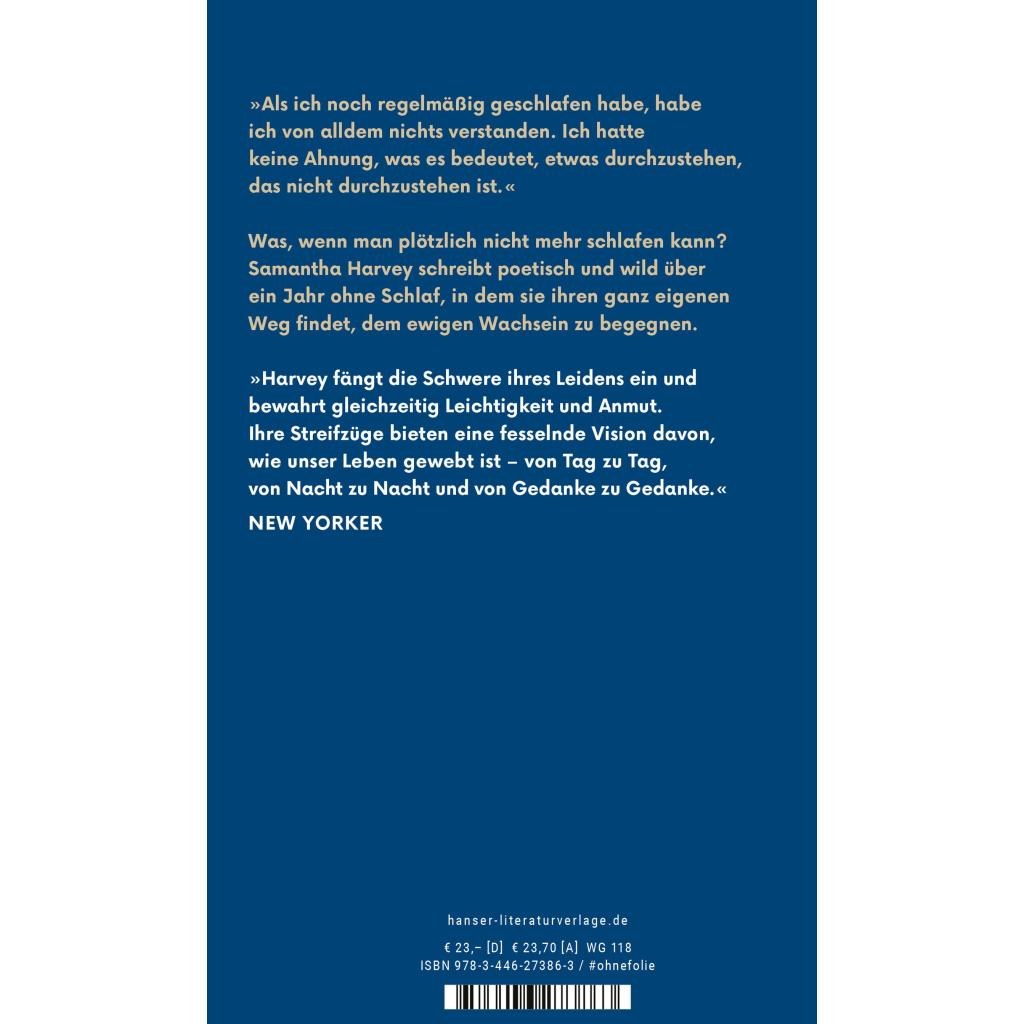 Originell, tiefgründig und mit Humor erkundet Samantha Harvey das Mysterium des Schlafs und die fatalen Folgen von Schlaflosigkeit. "Ein Meisterwerk, so gut, dass es mir den Atem verschlägt." (Helen Macdonald) Von einem Tag auf den anderen verliert die Schriftstellerin Samantha Harvey die Fähigkeit zu schlafen. Sie gerät in Panik und versucht alles, um ihre Schlaflosigkeit zu überwinden: Akupunktur, Sanskrit-Gesänge und Ernährungsumstellung, Dankestagebücher und Schlafapparaturen - nichts scheint zu helfen. Das Jahr ohne Schlaf ist ein eindringlicher innerer Monolog über ein Jahr ohne eine der grundlegenden menschlichen Lebensbedingungen. Originell, tiefgründig und mit Humor erkundet Harvey auf ihren nächtlichen Reisen das Erinnern, das Schreiben, Tod und Überlebenswillen und entwirft eine düster-komische Anatomie der Schlaflosigkeit. Ein genresprengendes literarisches Memoir von der Intensität jener Wachträume, die alle Schlaflosen heimsuchen.