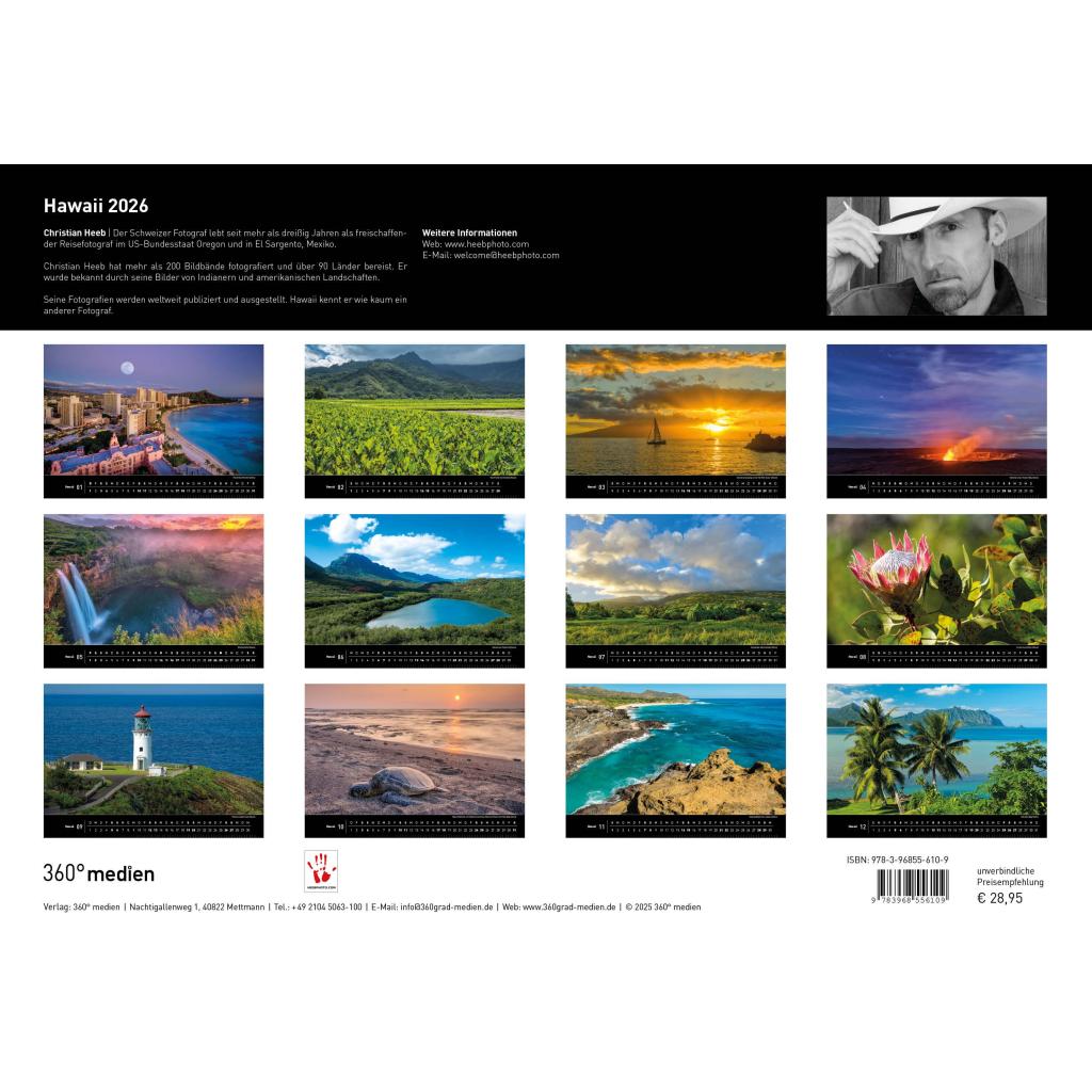 Aus traumhaften Hawaii-Aufnahmen des Fotografen Christian Heeb hat die Redaktion von 360° medien die 13 schönsten Motive ausgewählt und in diesem Kalender zusammen gestellt. Präsentiert werden die Fotos auf hochwertigem Papier im Format 50 cm x 35 cm.