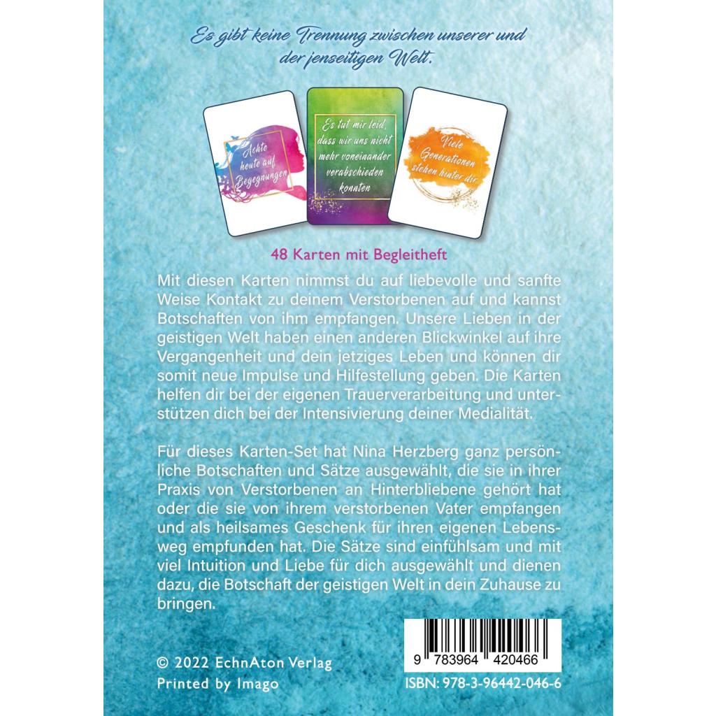Es gibt keine Trennung zwischen unserer und der jenseitigen Welt. Mit diesen Karten nimmst du auf liebevolle und sanfte Weise Kontakt zu deinem Verstorbenen auf und kannst Botschaften von ihm empfangen. Unsere Lieben in der geistigen Welt haben einen anderen Blickwinkel auf ihre Vergangenheit und dein jetziges Leben und können dir somit neue Impulse und Hilfestellung geben. Die Karten helfen dir bei der eigenen Trauerverarbeitung und unterstützen dich bei der Intensivierung deiner Medialität. Für dieses Karten-Set hat Nina Herzberg ganz persönliche Botschaften und Sätze ausgewählt, die sie in ihrer Praxis von Verstorbenen an Hinterbliebene gehört hat oder die sie von ihrem verstorbenen Vater empfangen und als heilsames Geschenk für ihren eigenen Lebensweg empfunden hat. Die Sätze sind einfühlsam und mit viel Intuition und Liebe für dich ausgewählt und dienen dazu, die Botschaft der geistigen Welt in dein Zuhause zu bringen.