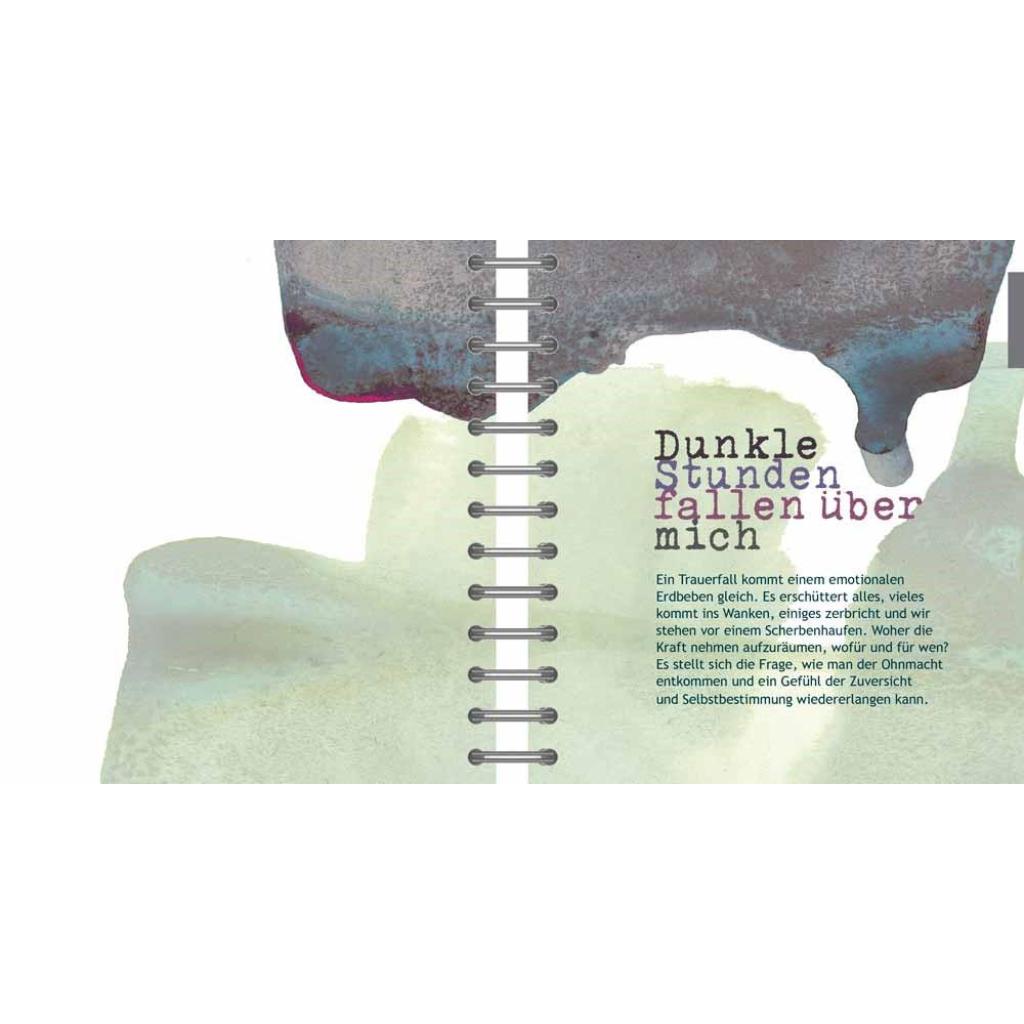 In der Trauer setzen wir uns mit vielen verschiedenen Dingen auseinander, die uns tief im Inneren bewegen, kein Lebensbereich bleibt davon unberührt. Die Gedanken zuzulassen und aufzuschreiben hilft, das Durcheinander im Kopf zu ordnen, Ängste und Wünsche zu formulieren, die niemand wertet, und lässt die Seele und den Geist zur Ruhe kommen. Dieses Buch gibt viele Anregungen zum Schreiben, Zeichnen, kreativ Gestalten, Durchdenken, Umwandeln von Dingen, die nicht passen ... Nimm dir 'Raum', finde dein eigenes Tempo, Zeit zum Traurigsein, Weinen, Beklagen, Trost finden, Annehmen, Hoffen und Glücklichsein. So wird es ein ganz persönliches 'Trauer Weg Buch': Dein Buch. Angela Holzmann insgesamt 230 Seiten davon 34 Transparentseiten