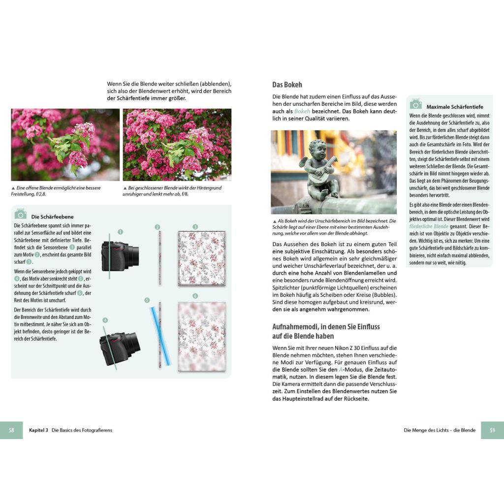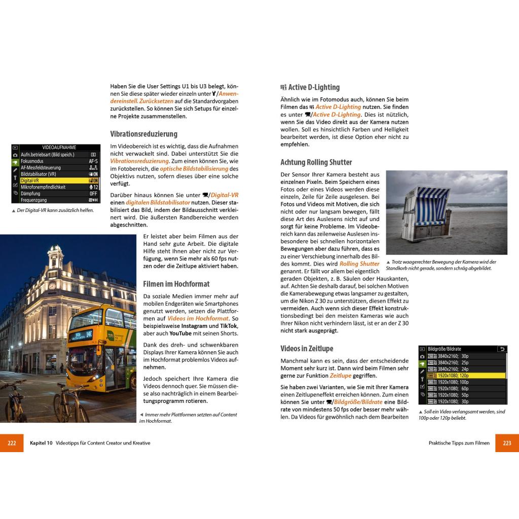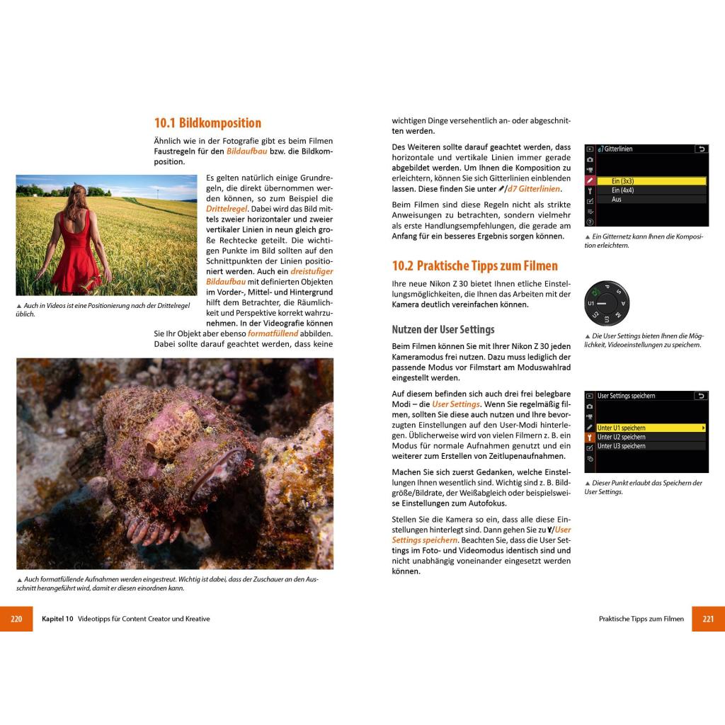 Setzen Sie Ihre kreativen Vlogging-Ideen mit der Nikon Z 30 professionell um! Dieses Buch erklärt Schritt für Schritt , wie Sie Videos mit erstklassiger Schärfe sowie bestem Ton aufnehmen und spannende Perspektiven gekonnt einfangen. Neben grundlegendem Know-how und nützlichen Profitipps beschreibt der Autor den Ablauf einer Videoerstellung für Social Media. Doch die Z 30 kann weit mehr. Von der Landschaftsfotografie über Porträt- und Actionaufnahmen bis hin zu brillanten Makros: Anschauliche Anleitungen zeigen, wie Sie das gesamte Potenzial der Kamera ausreizen - auch in schwierigen Situationen. Freuen Sie sich außerdem auf Anregungen für sinnvolles Zubehör und auf Hilfestellungen rund um die Verwendung externer Geräte. Erfahrenen Fotografen über die Schulter geschaut Autofokus, Belichtung und spezielle Funktionen im Detail Menu- und Einstellungstipps für den sofortigen Einsatz Aus dem Inhalt: Die Nikon Z 30 vorgestellt Grundeinstellungen & Inbetriebnahme Picture Control für perfekte Bildlooks Fotos ganz einfach optimal belichten Die manuelle Belichtungskorrektur Schwierige Lichtsituationen meistern Die Belichtung anpassen Wichtige Autofokusbetriebsarten Motive immer im Fokus halten Praxistipps zum Genrefotografieren Die Kamera individuell anpassen Bilder organisieren und bearbeiten Schärfe nachführen & zoomen im Film Kreative Movieeffekte einsetzen Externe Mikrofone synchronisieren Videobearbeitung und -export Ein Video für Social Media erstellen Fernsteuerung über Smartgeräte Zubehör, Kamerawartung und Pflege