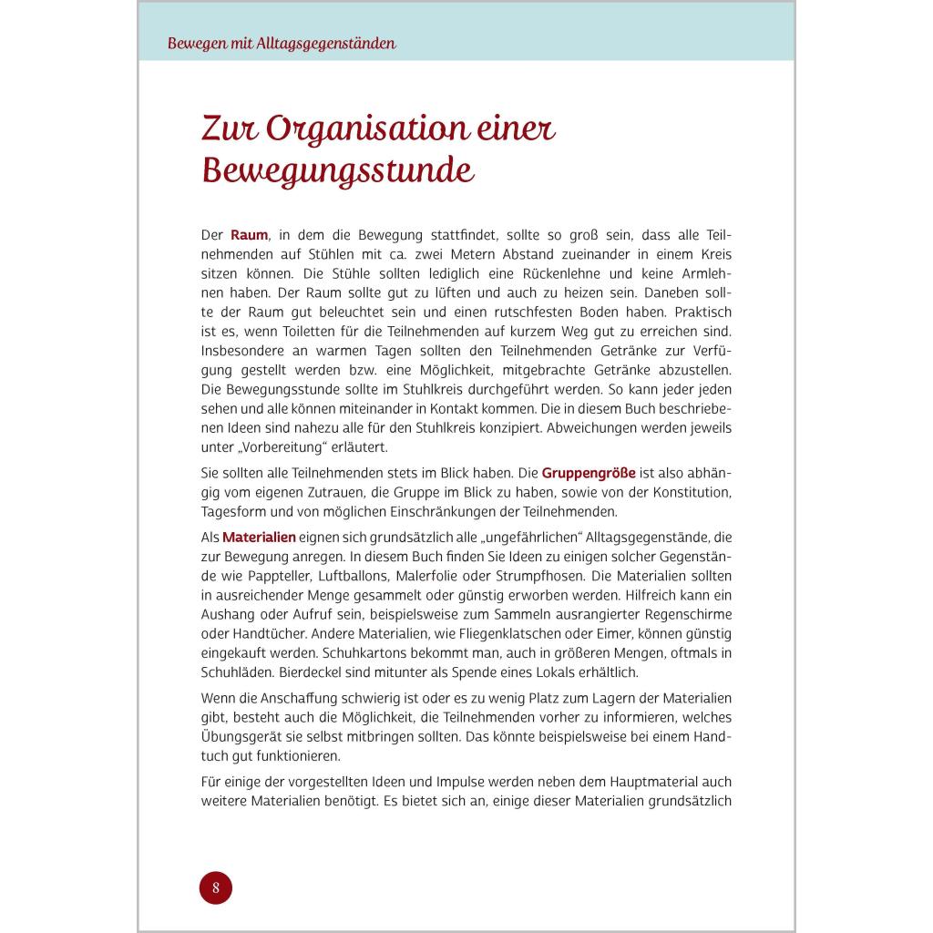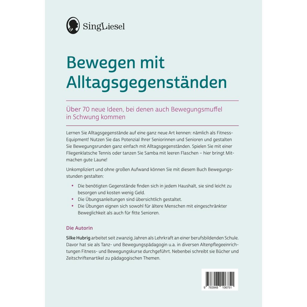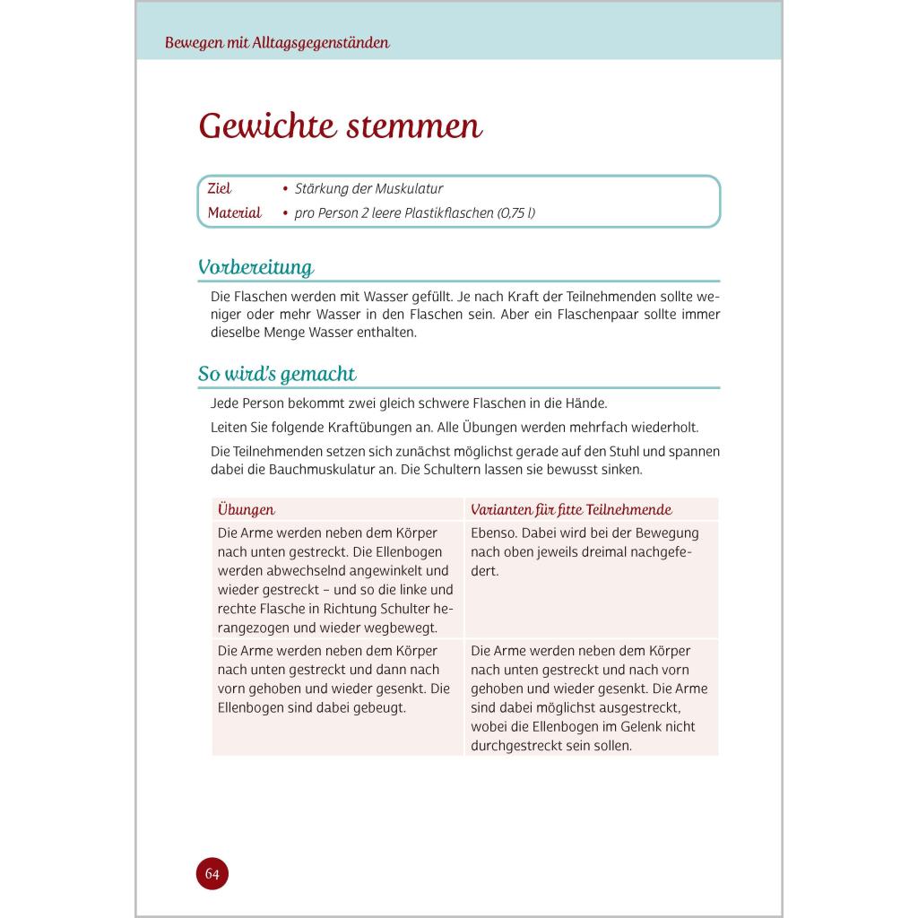 Bewegen mit Alltagsgegenständen Über 70 neue Ideen, bei denen auch Bewegungsmuffel in Schwung kommen Lernen Sie Alltagsgegenstände auf eine ganz neue Art kennen: nämlich als Fitness-Equipment! Nutzen Sie das Potenzial Ihrer Seniorinnen und Senioren und gestalten Sie Bewegungsrunden ganz einfach mit Alltagsgegenständen. Spielen Sie mit einer Fliegenklatsche Tennis oder tanzen Sie Samba mit leeren Flaschen - hier bringt Mitmachen gute Laune! Unkompliziert und ohne großen Aufwand können Sie mit diesem Buch Bewegungsstunden gestalten: ¿ Die benötigten Gegenstände finden sich in jedem Haushalt, sie sind leicht zu besorgen und kosten wenig Geld. ¿ Die Übungsanleitungen sind übersichtlich gestaltet. ¿ Die Übungen eignen sich sowohl für ältere Menschen mit eingeschränkter Beweglichkeit als auch für fitte Senioren.