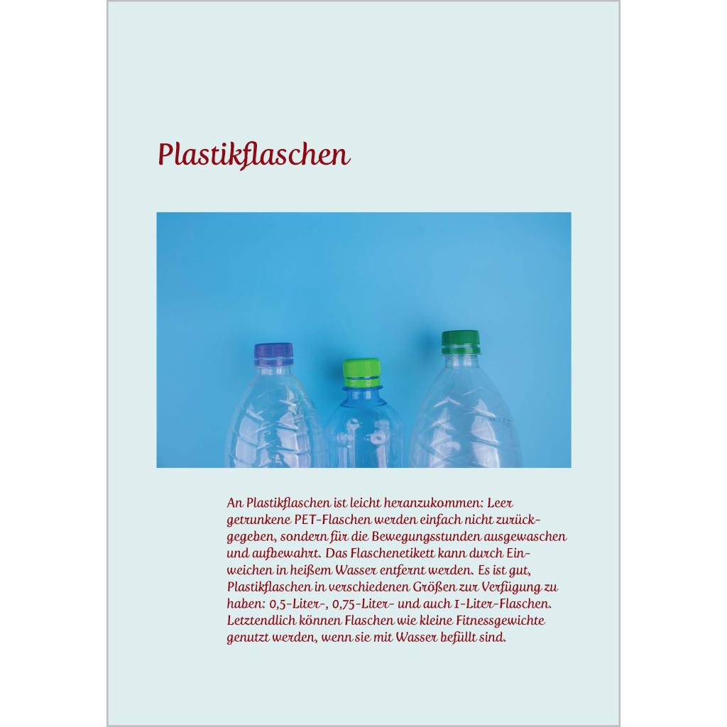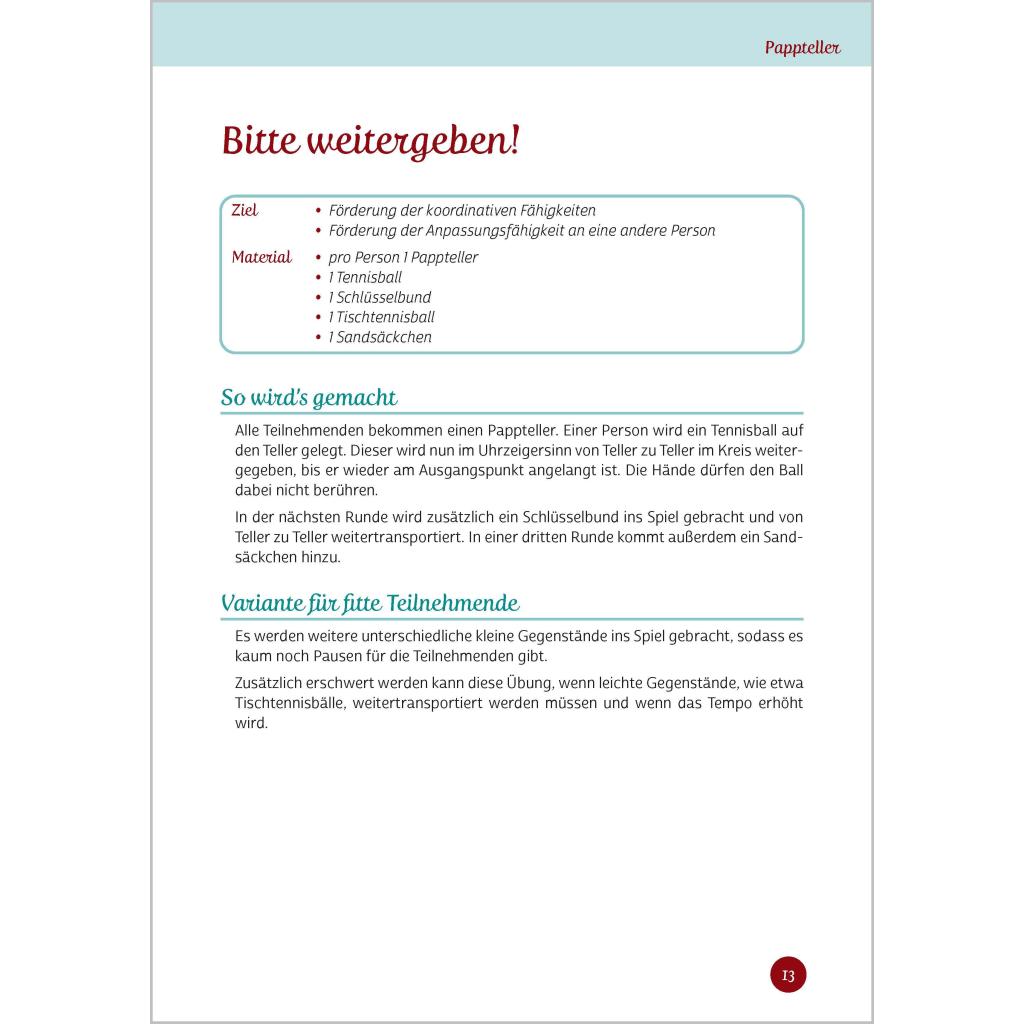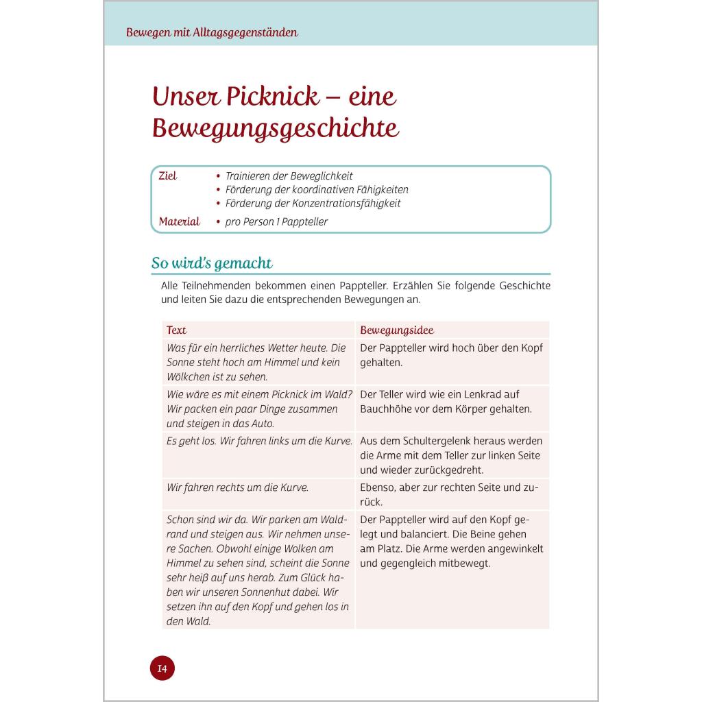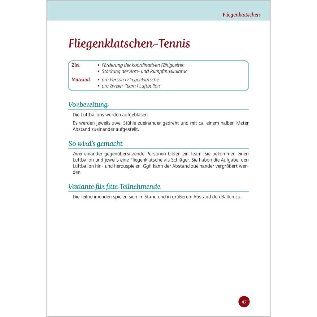 Bewegen mit Alltagsgegenständen Über 70 neue Ideen, bei denen auch Bewegungsmuffel in Schwung kommen Lernen Sie Alltagsgegenstände auf eine ganz neue Art kennen: nämlich als Fitness-Equipment! Nutzen Sie das Potenzial Ihrer Seniorinnen und Senioren und gestalten Sie Bewegungsrunden ganz einfach mit Alltagsgegenständen. Spielen Sie mit einer Fliegenklatsche Tennis oder tanzen Sie Samba mit leeren Flaschen - hier bringt Mitmachen gute Laune! Unkompliziert und ohne großen Aufwand können Sie mit diesem Buch Bewegungsstunden gestalten: ¿ Die benötigten Gegenstände finden sich in jedem Haushalt, sie sind leicht zu besorgen und kosten wenig Geld. ¿ Die Übungsanleitungen sind übersichtlich gestaltet. ¿ Die Übungen eignen sich sowohl für ältere Menschen mit eingeschränkter Beweglichkeit als auch für fitte Senioren.