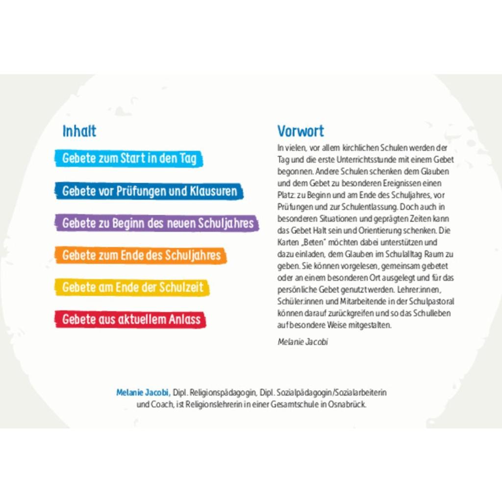 | Beilage: | DIN A5, 31 Karten, 30 Gebete, beidseitig bedruckt, Fotos, auf festem 300g-Karton, in farbiger Pappbox, plastikfrei verpackt mit OVP-Siegel |