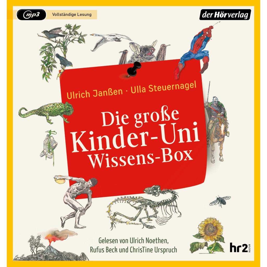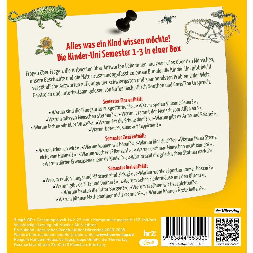 Alles was ein Kind wissen möchte! Die Kinder-Uni Semester 1 bis 3 in einer Box Fragen über Fragen, die Antworten über Antworten bekommen und zwar alles über den Menschen, unsere Geschichte und die Natur zusammengefasst zu einem Bundle. Die Kinder-Uni gibt leicht verständliche Antworten auf einige der schwierigsten und spannendsten Probleme der Welt. Geistreich und unterhaltsam gelesen von Rufus Beck, Ulrich Noethen und ChrisTine Urspruch. Semester eins enthält: Warum sind die Dinosaurier ausgestorben? Warum speien Vulkane Feuer? Warum gibt es Arme und Reiche? Warum lachen wir über Witze? Warum müssen Menschen sterben? Warum stammt der Mensch vom Affen ab? Warum beten Muslime auf Teppichen? Warum ist die Schule doof? Semester zwei enthält: Warum darf man Menschen nicht klonen? Warum sind die griechischen Statuen nackt? Warum träumen wir? Warum können wir hören? Warum dürfen Erwachsene mehr als Kinder? Warum wachsen Pflanzen? Warum bin ich Ich? Warum fallen Sterne vom Himmel? Semester drei enthält: Warum bauten die Ritter Burgen? Warum raufen Jungs und sind Mädchen zickig? Warum gibt es Blitz und Donner? Warum können Ärzte heilen? Warum sehen Fledermäuse mit den Ohren? Warum werden Sportler immer besser? Warum erzählen wir Geschichten? Warum können Mathematiker nicht rechnen? Lesung mit Musik mit Ulrich Noethen, Rufus Beck, ChrisTine Urspruch 3 MP3-CDs, 14h 22min