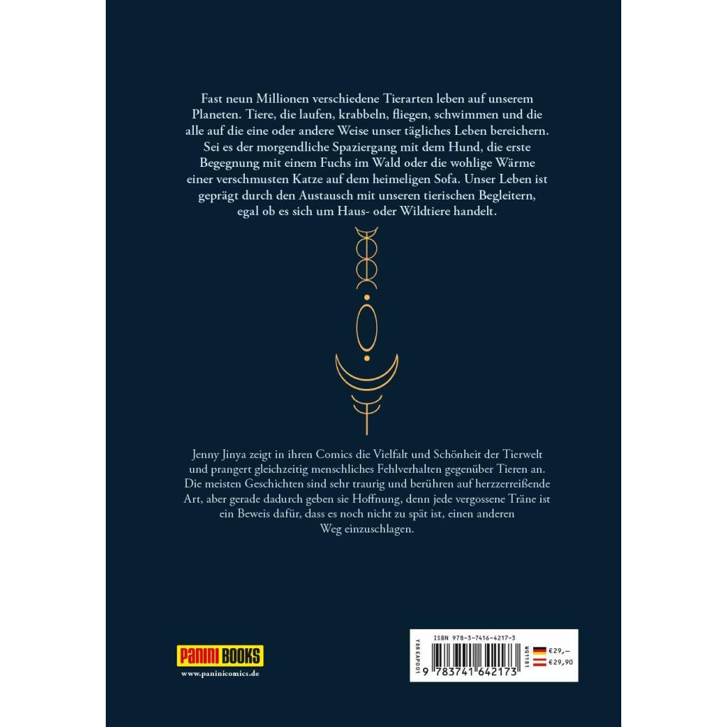 Fast neun Millionen verschiedene Tierarten leben auf unserem Planeten. Tiere, die laufen, krabbeln, fliegen, schwimmen und die alle auf die eine oder andere Weise unser tägliches Leben bereichern. Sei es der morgendliche Spaziergang mit dem Hund, die erste Begegnung mit einem Fuchs im Wald oder die wohlige Wärme einer verschmusten Katze auf dem heimeligen Sofa. Unser Leben ist geprägt durch den Austausch mit unseren tierischen Begleitern, egal ob es sich um Haus- oder Wildtiere handelt. Jenny Jinya zeigt in ihren Comics die Vielfalt und Schönheit der Tierwelt und prangert gleichzeitig menschliches Fehlverhalten gegenüber Tieren an. Die meisten Geschichten sind sehr traurig und berühren auf herzzerreißende Art, aber gerade dadurch geben sie Hoffnung, denn jede vergossene Träne ist ein Beweis dafür, dass es noch nicht zu spät ist, einen anderen Weg einzuschlagen.