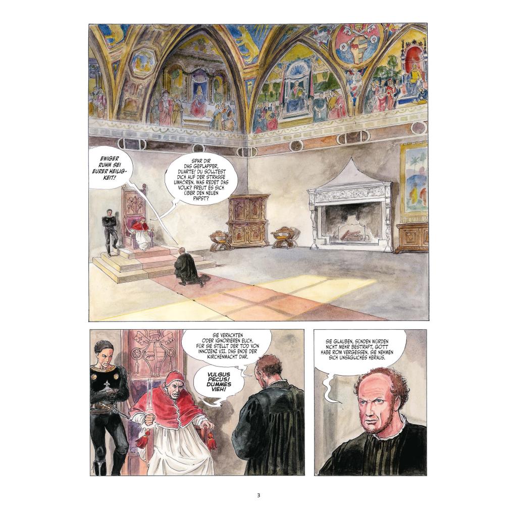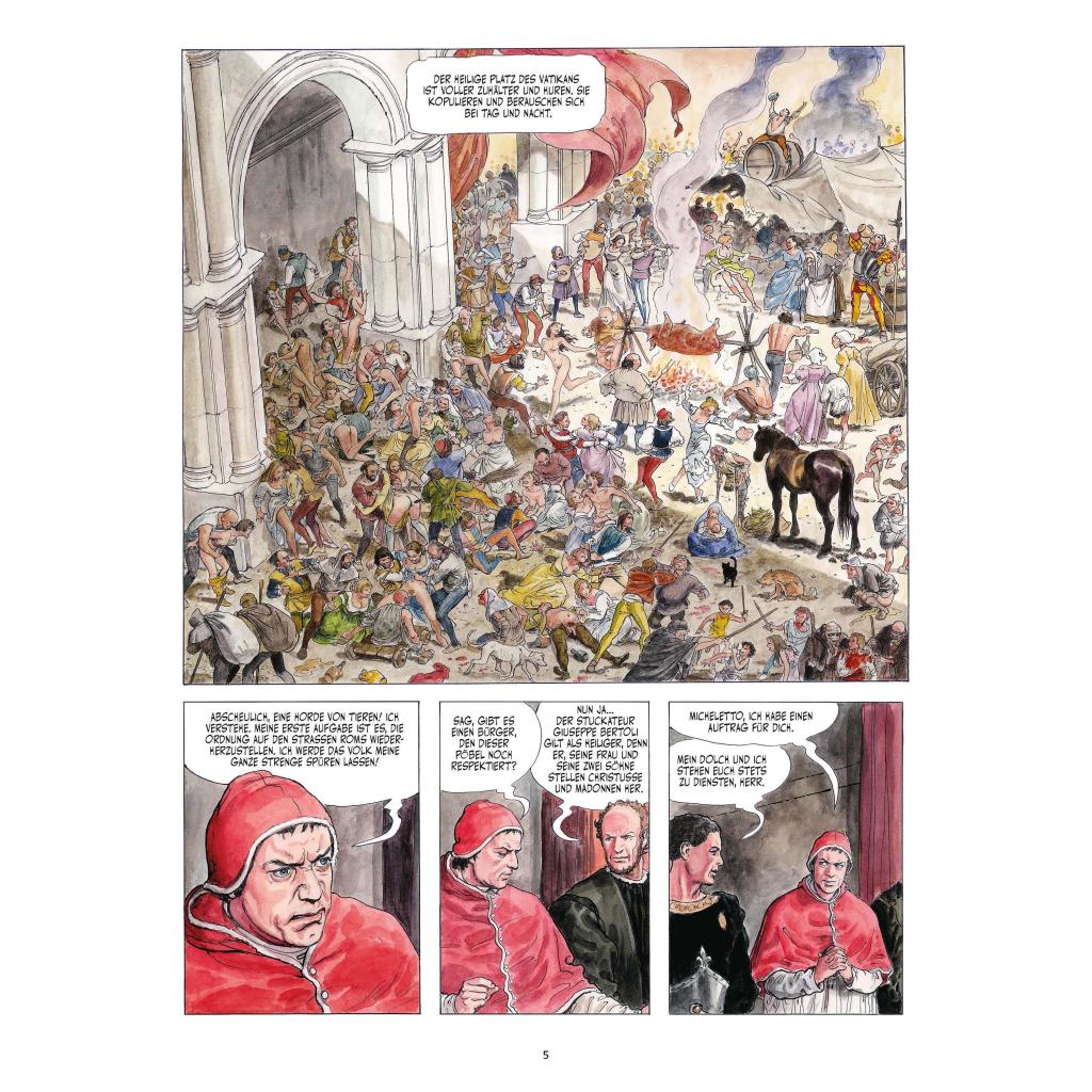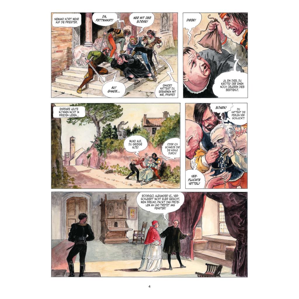 Im 15. Jahrhundert sorgte das Geschlecht der Borgia reihenweise für Skandale: Vergiftung und Brudermord, Korruption und Inzest sind nur einige der Vorwürfe, die gegen das Adelsgeschlecht erhoben wurden. Die Familiendynastie, aus der ihrerzeit gleich zwei Päpste hervorgingen, ist so verrufen wie einflussreich. Die Borgias sind die prominentesten Symbole für die Dekadenz der Kirche und des mittelalterlichen Adels und gelten mit Fug und Recht als erste Mafia der Geschichte. Gewalt und Wollust, Intrigen und Verschwörungen bilden den Rahmen dieses historischen Comic-Epos, das von Alejandro Jodorowsky in fieberhaftem Stil erzählt und von Milo Manara verführerisch opulent illustriert wird. Beinhaltet einen exklusiven Kunstdruck.