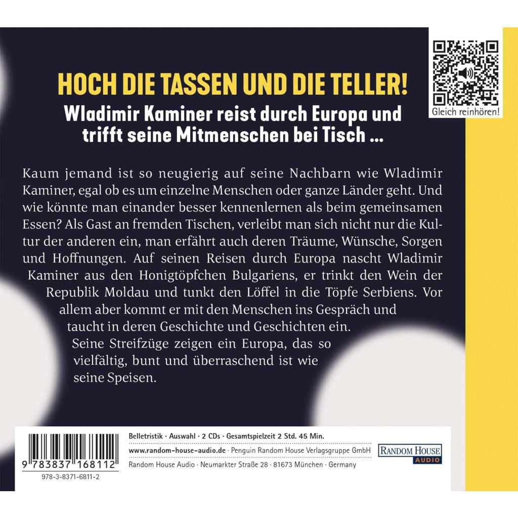 Hoch die Tassen und die Teller! Wladimir Kaminer trifft das alte und das zukünftige Europa bei Tisch Kaum jemand ist so neugierig auf seine Nachbarn wie Wladimir Kaminer. Egal ob es um einzelne Menschen oder ganze Länder geht. Und wie könnte man einander besser kennenlernen als beim gemeinsamen Essen? Ist man zu Gast an fremden Tischen, verleibt man sich nicht nur die Kultur der anderen ein, man erfährt auch deren Träume, Wünsche, Sorgen und Hoffnungen. Auf seinen Reisen durch Europa nascht Wladimir Kaminer von den Tellern Portugals ebenso wie aus den Honigtöpfchen Bulgariens, er trinkt den Wein der Republik Moldau und tunkt den Löffel in die Töpfe Serbiens. Vor allem aber kommt er mit den Menschen ins Gespräch und taucht tief in deren Geschichte und Geschichten ein. Seine Streifzüge zeigen ein Europa, das so vielfältig, bunt und überraschend ist wie seine Speisen. Auswahl mit Wladimir Kaminer 2 CDs, ca. 2h 30min
