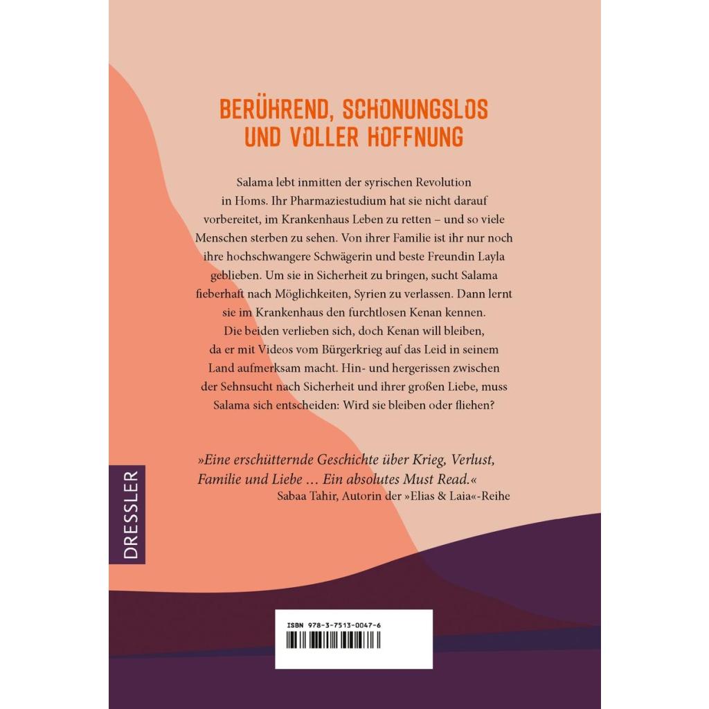 Die junge Salama lebt inmitten der syrischen Revolution in Homs. Sie hilft im Krankenhaus aus, muss dort aber oft hilflos zusehen, wie Menschen sterben. Während ihr Land zerbricht, sucht sie fieberhaft nach Möglichkeiten, Syrien zu verlassen. Auch um ihre schwangere Schwägerin Layla, die einzige Überlebende ihrer Familie, in Sicherheit zu bringen. Im Krankenhaus lernt Salama den jungen furchtlosen Kenan kennen. Die beiden verlieben sich, doch Kenan will bleiben und mit Internetvideos auf das Leid in seinem Land aufmerksam machen. Salama muss sich entscheiden: zwischen Sicherheit und ihrer großen Liebe. Ausgezeichnet mit dem Salon5-Jugendbuchpreis. Hochtalentierte junge Autorin mit einzigartiger Stimme. Thematisiert das Thema Flucht berührend, schonungslos offen und voller Hoffnung .
