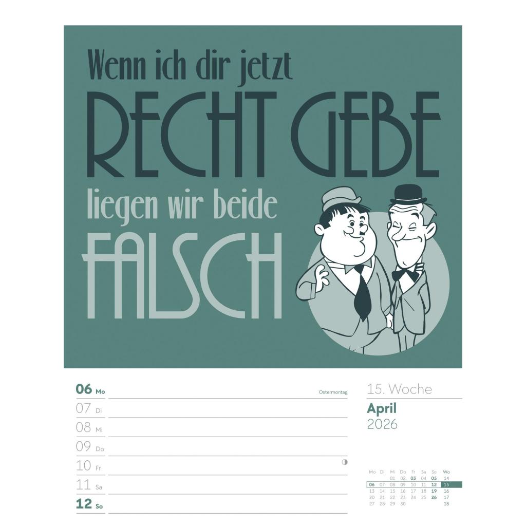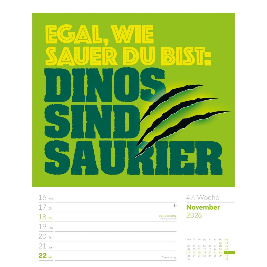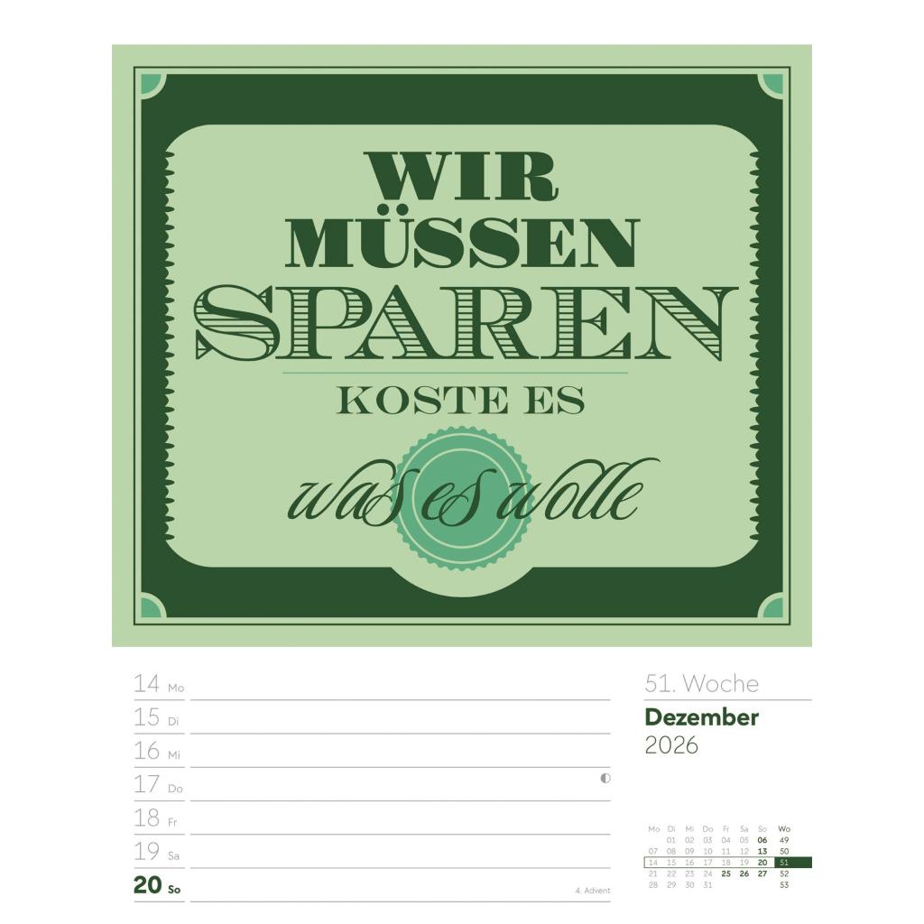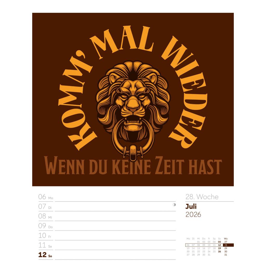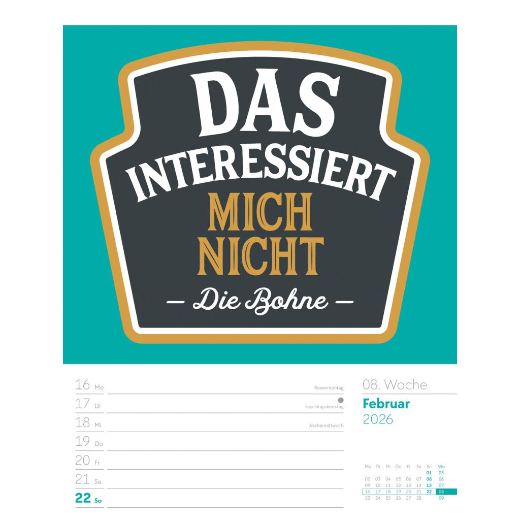 | Fachschema: | Kalender / Humor, Satire, Cartoons, Comic~Kalender / Wandkalender~Kalender / Zitate, Sprüche~Kunst / Kalender~Rätsel / Kalender |