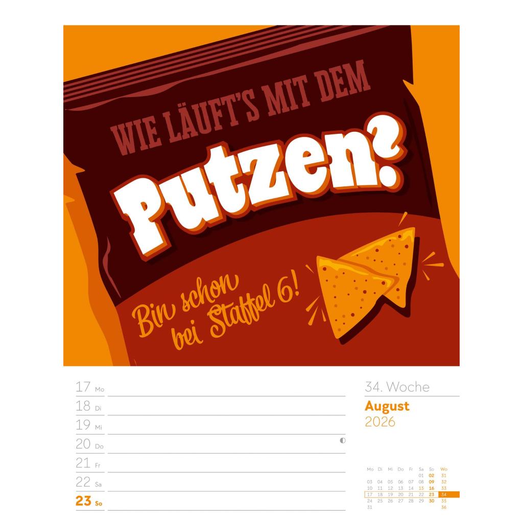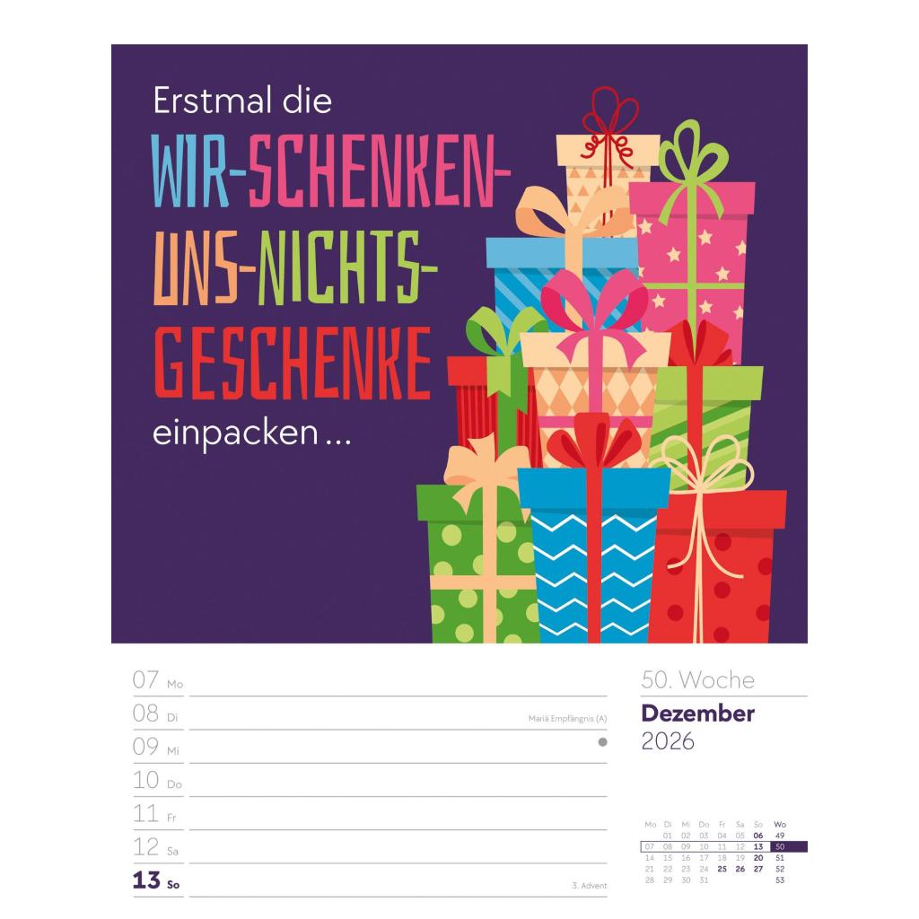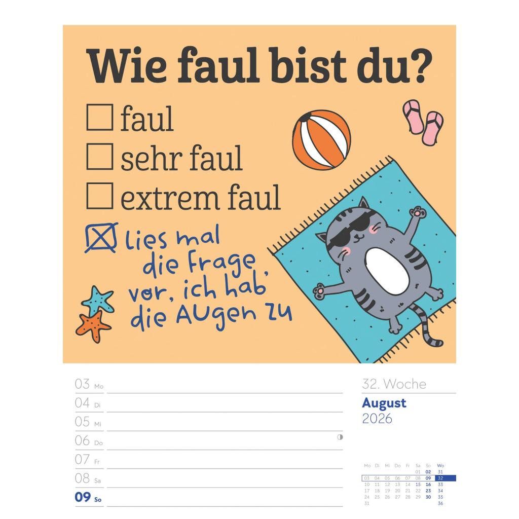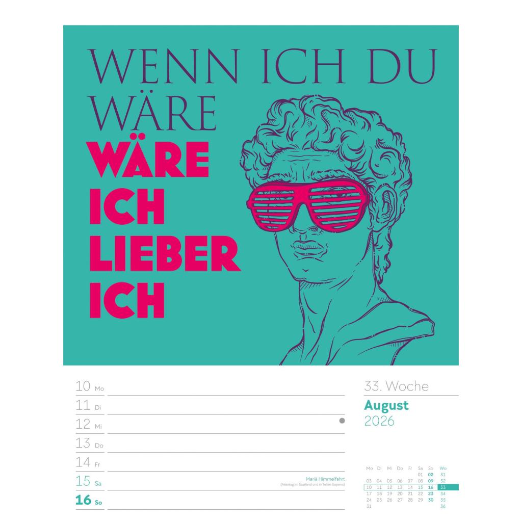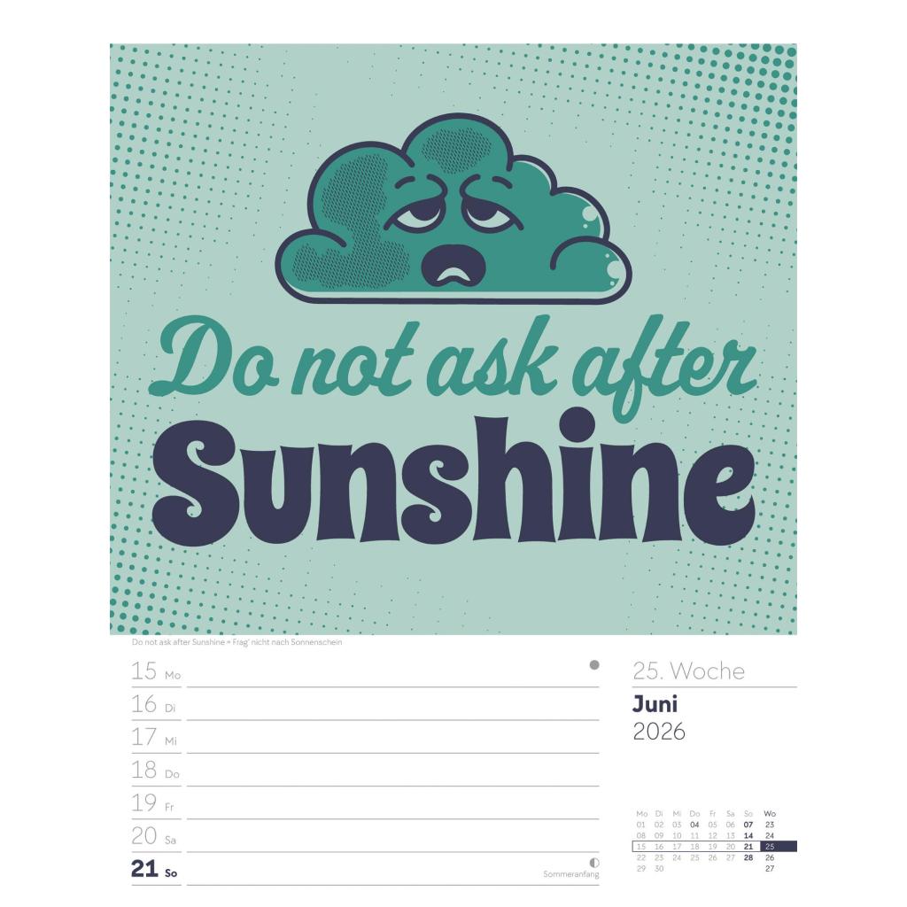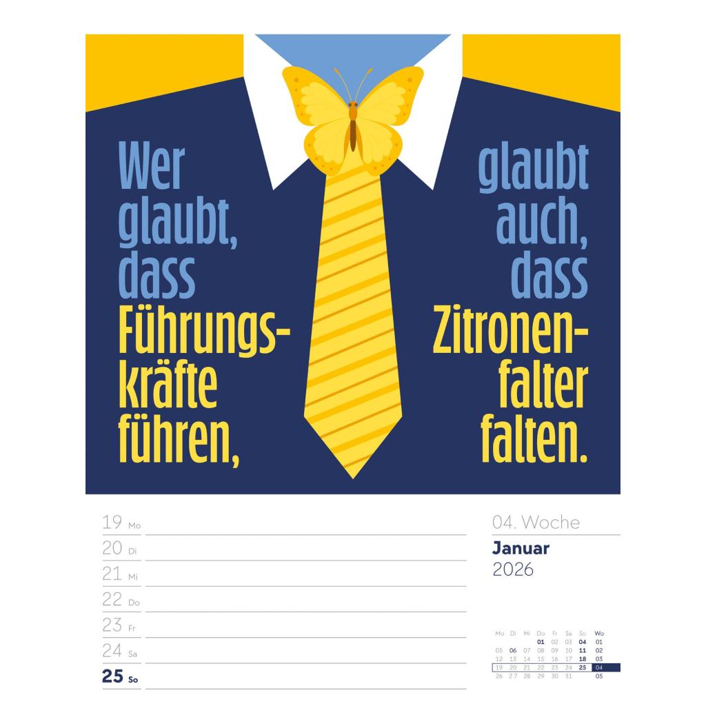 | Fachschema: | Kalender / Humor, Satire, Cartoons, Comic~Kalender / Wandkalender~Kalender / Zitate, Sprüche~Kunst / Kalender~Rätsel / Kalender |