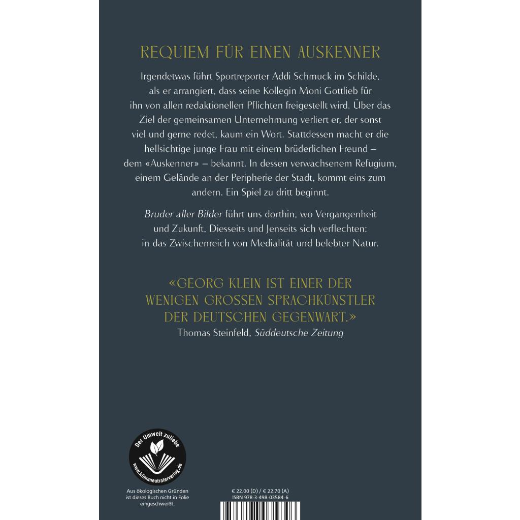 Irgendetwas führt Sportreporter Addi Schmuck im Schilde, als er arrangiert, dass seine junge Kollegin Moni Gottlieb für ihn von allen redaktionellen Pflichten freigestellt wird. Ebenso zwingend selbstverständlich scheint, dass sie ihr Smartphone zu Hause lassen muss, bevor sie die Arena des Bundesliga-Clubs am Südrand der Stadt ansteuern. Der dortige Greenkeeper hat mit einem rätselhaften Naturphänomen zu kämpfen und erhofft sich von Schmuck einen rettenden Rat. Allerdings ist Schmuck in dieser Frage selbst des Beistands bedürftig. Er macht seine Kollegin mit einem brüderlichen Freund bekannt, der ein merkwürdig verwachsenes Refugium bewohnt und nur «der Auskenner» genannt wird. Ein Spiel zu dritt beginnt. Und Moni Gottlieb, die ebenso vorsichtig wie hellsichtig ist, darf erfahren, wie sich Diesseits und Jenseits verflechten können. Kaum ein Schriftsteller unserer Zeit handhabt die Mittel der erzählenden Literatur subtiler als Georg Klein, kaum einer treibt das Spiel mit größerem Vergnügen und Eigensinn voran. Sein neuer Roman führt uns in die Redaktion einer traditionsreichen süddeutschen Regionalzeitung - und in das Zwischenreich von Medialität und belebter Natur. Eine dunkle Komödie in leuchtender Prosa.
