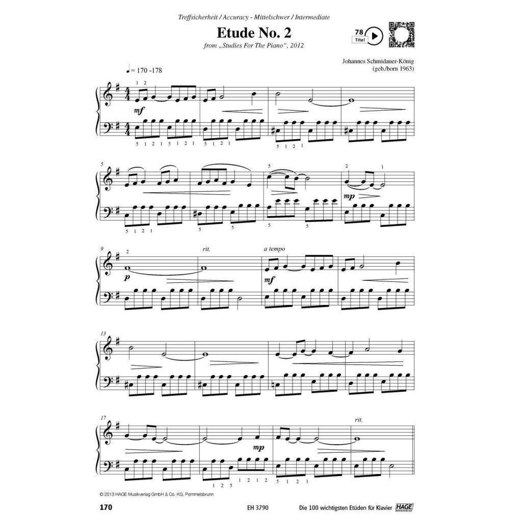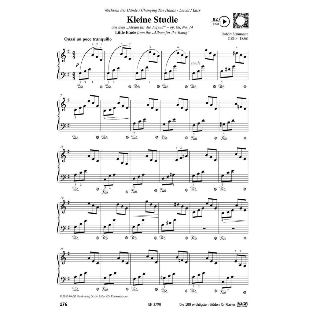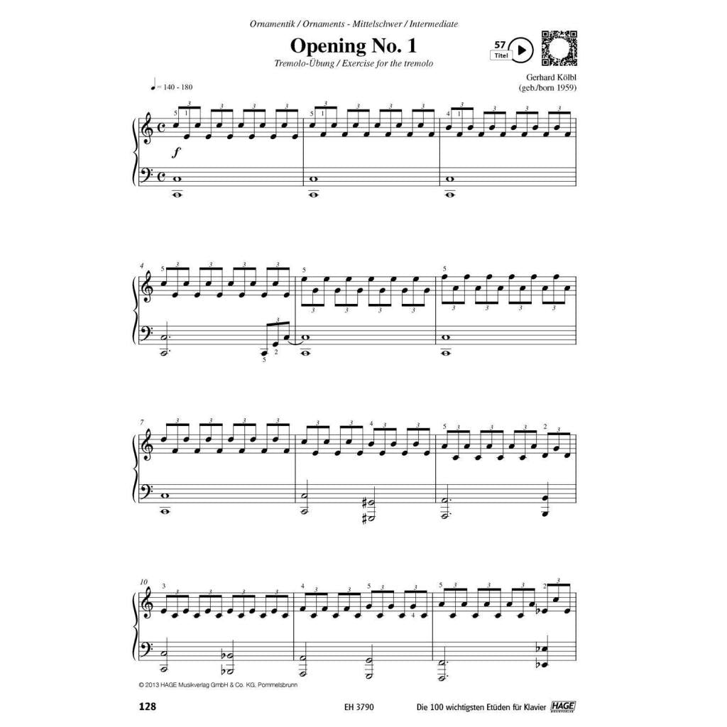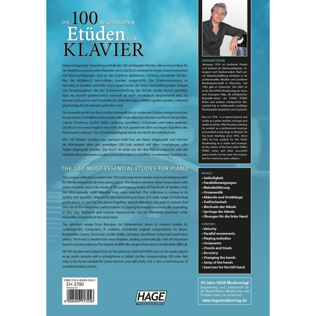 Diese einzigartige Sammlung enthält die 100 wichtigsten Etüden, die unverzichtbar für die Ausbildung eines jeden Pianisten sind. Das Buch entstand in enger Zusammenarbeit mit Klavierpädagogen und ist das Ergebnis akribischer Sichtung hunderter Etüden. Nur die didaktisch wertvollsten wurden ausgewählt. Die Etüdensammlung ist einmalig in Qualität und Fülle und erspart einem die teure Anschaffung einer Vielzahl von Einzelausgaben. Bei der Zusammenstellung der Stücke wurde darauf geachtet, dass sie sowohl spieltechnisch wertvoll als auch musikalisch ansprechend sind. So können technische und musikalische Anforderungen effektiv geübt werden, während gleichzeitig die Musikalität gefördert wird. Die Auswahl reicht von Barock über Romantik bis zu modernen Etüden zeitgenössischer Komponisten. Enthalten sind wundervolle Originalkompositionen von Beyer, Burgmüller, Czerny, Duvernoy, Gurlitt, Heller, Lemoine, Löschhorn, Schumann und vielen anderen. Das Buch ist in neun Kapitel unterteilt, die sich gezielt mit allen wichtigen Aspekten des Pianospiels befassen. Der Schwierigkeitsgrad reicht von leicht bis mittelschwer. Alle 100 Etüden wurden von Gerhard Kölbl live am Piano eingespielt und können als Hörbeispiel über den jeweiligen QR-Code einfach mit dem Smartphone oder Tablet abgespielt werden. Das Buch ist nicht nur für den Klavierunterricht und das Selbststudium geeignet, sondern auch eine wahre Schatzkiste wunderbarer Spielstücke. ---------- This unique collection contains the 100 most important etudes which are indispensable for the development of every piano player. The book evolved in close cooperation with piano teachers, and is the result of the painstaking review of hundreds of studies. Only the educationally most valuable ones were selected. The collection is unique in its quality and quantity, and avoids the expensive purchase of a wide range of individual publications. In putting the pieces together, special attention was paid to ensure that they are at the same time useful in terms of playing technique and musically appealing. In this way, technical and musical requirements can be effectively practised while musicality is fostered at the same time. The selection ranges from Baroque, via Romanticism, down to modern studies by contemporary composers. It contains wonderful original compositions by Beyer, Burgmüller, Czerny, Duvernoy, Gurlitt, Heller, Lemoine, Löschhorn, Schumann and many others. The book is divided into nine chapters, dealing systematically with all important aspects of piano playing. The degree of difficulty ranges from easy to moderately difficult. All 100 studies were played live on the piano by Gerhard Kölbl and can be easily played as an audio sample with a smartphone or tablet via the corresponding QR code. Not only is the book suitable for piano lessons and self-study, but is also a real treasure of wonderful piano pieces.