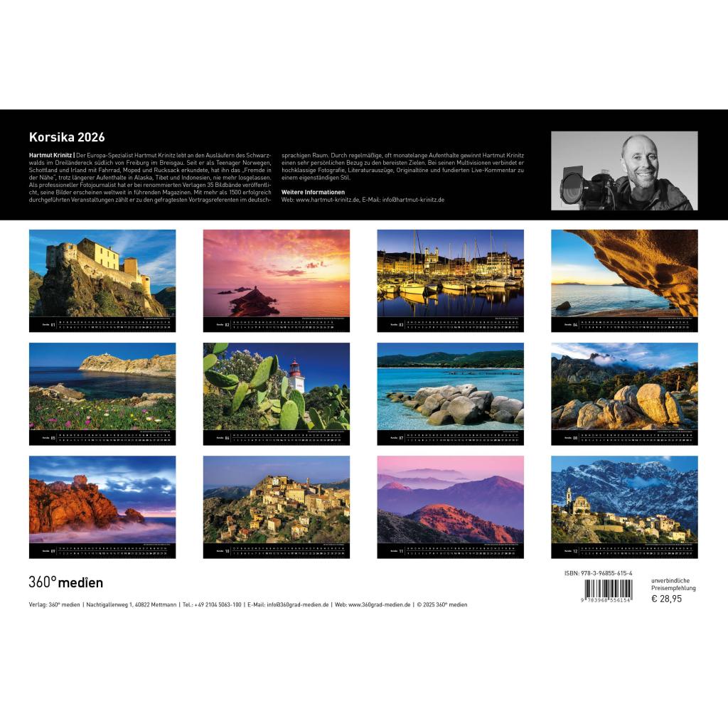 Aus traumhaften Korsika-Aufnahmen des Fotografen Hartmut Krinitz hat die Redaktion von 360° medien die 13 schönsten Motive ausgewählt und in diesem Kalender zusammen gestellt. Präsentiert werden die Fotos auf hochwertigem Papier im Format 50 cm x 35 cm.