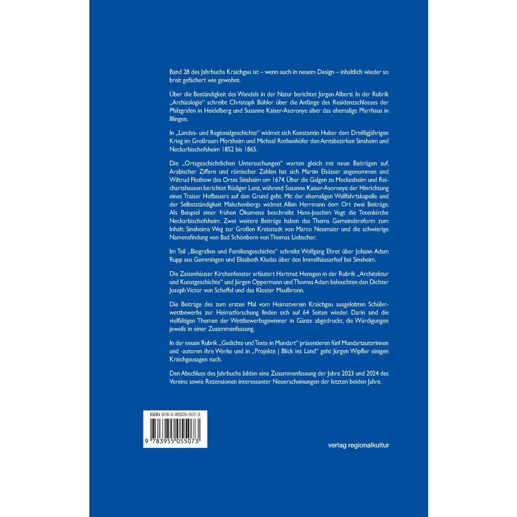 Band 28 des Jahrbuchs Kraichgau ist - wenn auch in neuem Design - inhaltlich wieder so breit gefächert wie gewohnt. Über die Beständigkeit des Wandels in der Natur berichtet Jürgen Alberti. In der Rubrik "Archäologie" schreibt Christoph Bühler über die Anfänge des Residenzschlosses der Pfalzgrafen in Heidelberg und Susanne Kaiser-Asoronye über das ehemalige Pfarrhaus in Illingen. In "Landes- und Regionalgeschichte" widmet sich Konstantin Huber dem Dreißigjährigen Krieg im Großraum Pforzheim und Michael Rothenhöfer den Amtsbezirken Sinsheim und Neckarbischofsheim 1852 bis 1865. Die "Ortsgeschichtlichen Untersuchungen" warten gleich mit neun Beiträgen auf. Arabischer Ziffern und römischer Zahlen hat sich Martin Elsässer angenommen und Wiltrud Flothow des Ortes Sinsheim um 1674. Über die Galgen zu Meckesheim und Reichartshausen berichtet Rüdiger Lenz, während Susanne Kaiser-Asoronye der Hinrichtung eines Traiser Hofbauers auf den Grund geht. Mit der ehemaligen Wallfahrtskapelle und der Selbstständigkeit Malschenbergs widmet Albin Herrmann dem Ort zwei Beiträge. Als Beispiel einer frühen Ökumene beschreibt Hans-Joachim Vogt die Totenkirche Neckarbischofsheim. Zwei weitere Beiträge haben das Thema Gemeindereform zum Inhalt: Sinsheims Weg zur Großen Kreisstadt von Marco Neumaier und die schwierige Namensfindung von Bad Schönborn von Thomas Liebscher. Im Teil "Biografien und Familiengeschichte" schreibt Wolfgang Ehret über Johann Adam Rupp aus Gemmingen und Elisabeth Kludas über den Immelhäuserhof bei Sinsheim. Die Zaisenhäuser Kirchenfenster erläutert Hartmut Hensgen in der Rubrik "Architektur und Kunstgeschichte" und Jürgen Oppermann und Thomas Adam beleuchten den Dichter Joseph Victor von Scheffel und das Kloster Maulbronn. Die Beiträge des zum ersten Mal vom Heimatverein Kraichgau ausgelobten Schülerwettbewerbs zur Heimatforschung finden sich auf 64 Seiten wieder. Darin sind die vielfältigen Themen der Wettbewerbsgewinner in Gänze abgedruckt, die Würdigungen jeweils in einer Zusammenfassung. In der neuen Rubrik "Gedichte und Texte in Mundart" präsentieren fünf Mundartautorinnen und -autoren ihre Werke und in "Projekte | Blick ins Land" geht Jürgen Wipfler einigen Kraichgausagen nach. Den Abschluss des Jahrbuchs bilden eine Zusammenfassung der Jahre 2023 und 2024 des Vereins sowie Rezensionen interessanter Neuerscheinungen der letzten beiden Jahre.