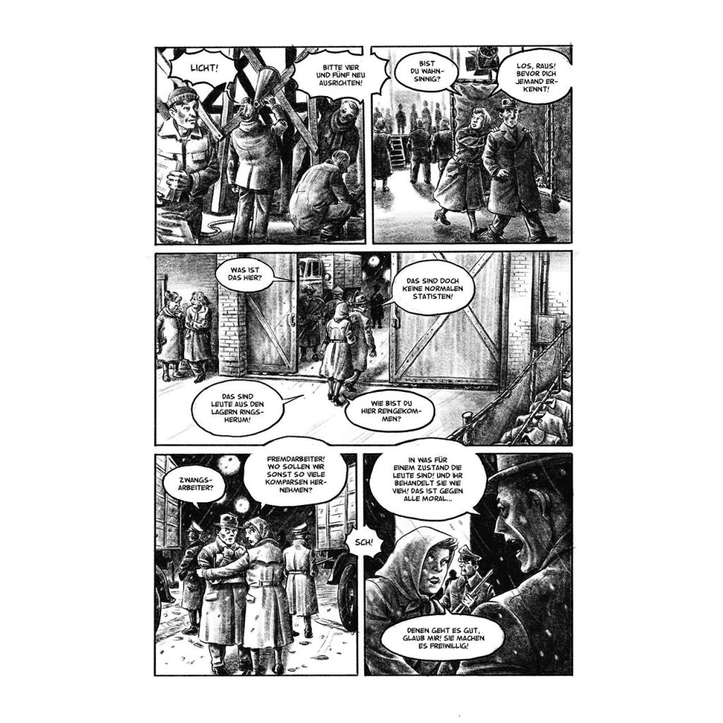 Sonderausgabe mit signiertem Exlibris - limitiert auf 500 Exemplare. Berlin, Spätsommer 1944: Heinz Hoffmann lebt seit elf Jahren als 'verbotener Autor' in der inneren Emigration, als ein Luftangriff seine Wohnung zerstört und er Zuflucht bei seiner ehemaligen Geliebten Erika Harms suchen muss. Die UFA- Mitarbeiterin bringt ihn ins Spiel, als händeringend ein Ghostwriter für das Drehbuch eines vom NS-Propagandaministerium dringlichst angeforderten 'Durchhaltefilms' gesucht wird. Durch Widrigkeiten und staatliche Repressalien mürbe geworden, lässt Heinz sich schließlich darauf ein... Als die Filmproduktion dauerhafter Bombardierungen wegen von Babelsberg aufs Land verlegtwird, finden sich auch Heinz und Erika unter denGlücklichen, die mitreisen dürfen. Und während in ihrem Potemkinschen Dorf bald niemand mehr weiß, ob ihr Tun angesichts der auch hier nahenden Alliierten noch zielführend ist, ringt Heinz Hoffmann mit seinem Gewissen: Wie sehr ist er um des Überlebens willen ein Teil des national-sozialistischen Systems geworden? Mitreißend und in grandios-atmosphärischen Zeichnungen erzählt e.o.plauen-Preisträgerin Isabel Kreitz angelehnt an die Biografien Erich Kästners und weiterer Kulturschaffender eine Geschichte über Künstler:innen in der Diktatur, innere Emigration und den letzten Film des 'Dritten Reichs'.