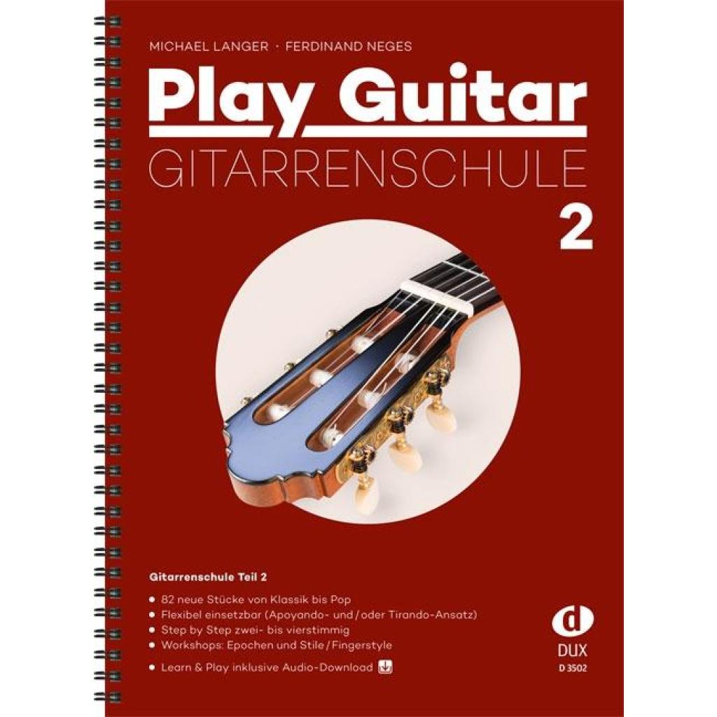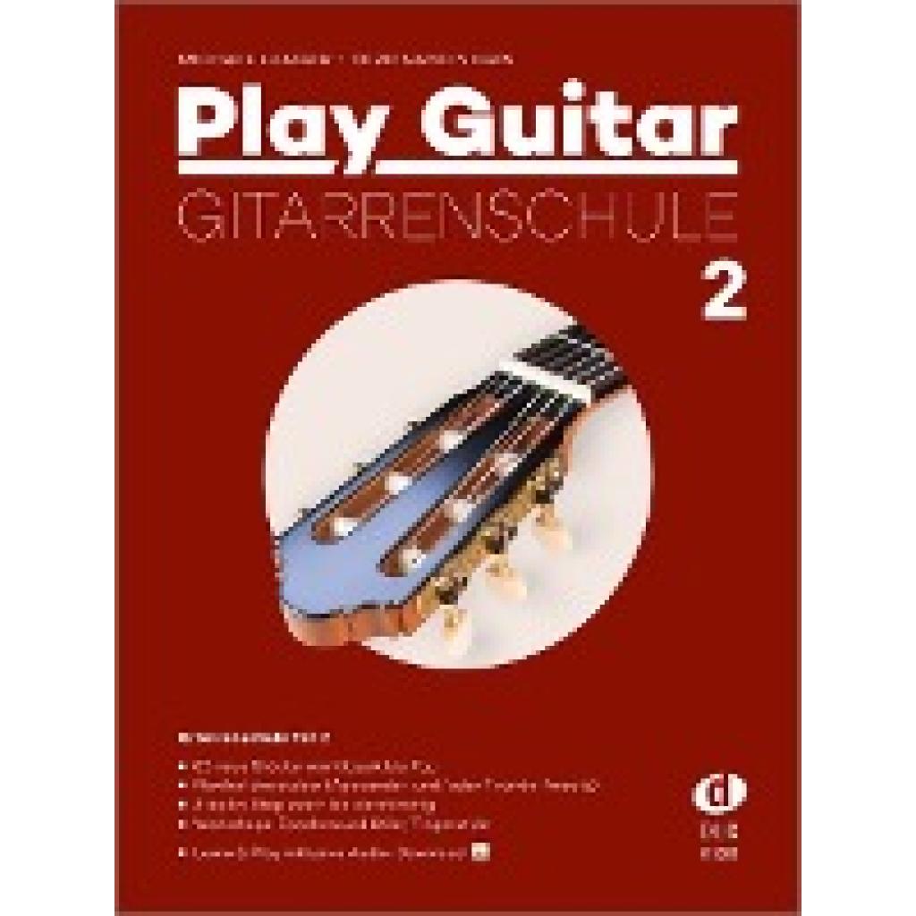 'Play Guitar' ist eine Gitarrenschule in zwei Teilen. Der Schüler kann die beiden Anschlagsarten Apoyando (Spiel mit Anlegen) und Tirando (Spiel ohne Anlegen) wahlweise gleichzeitig oder nacheinander erlernen. Play Guitar bietet eine große Vielfalt an Kompositionen und Arrangements, welche die stilistische Bandbreite des Gitarrenspiels schon Anfängern zugänglich machen soll. Zahlreiche Abbildungen in neuen Perspektiven verdeutlichen die technischen Abläufe auf leicht verständliche Weise. Workshops befassen sich mit Blues und Liedbegleitung.Voraussetzung für den Einstieg in Teil 2 ist die Kenntnis der auf den sechs Gitarrensaiten in der I. Lage vorkommenden Stammtöne der C-Dur-Tonleiter sowohl im Notenbild als auch auf dem Griffbrett. Akkordzerlegungen sind ein wesentlicher Bestandteil von Band 2.