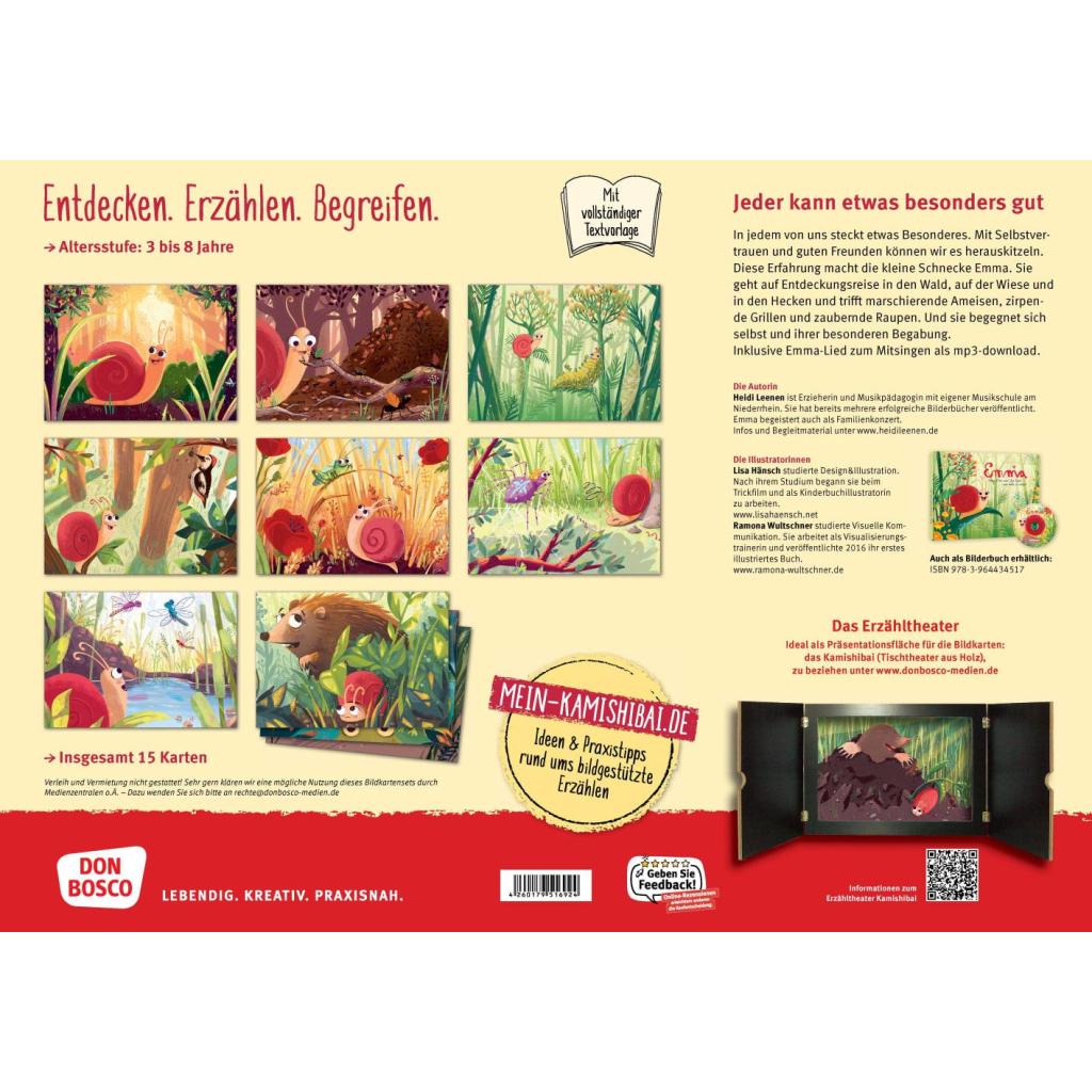 | Beilage: | DIN A3, 15 Bildkarten, einseitig bedruckt, auf festem 300g-Karton, farbig illustriert, inkl. Textvorlage, inkl. Downloadcode für das "Emma-Lied" als mp3 |