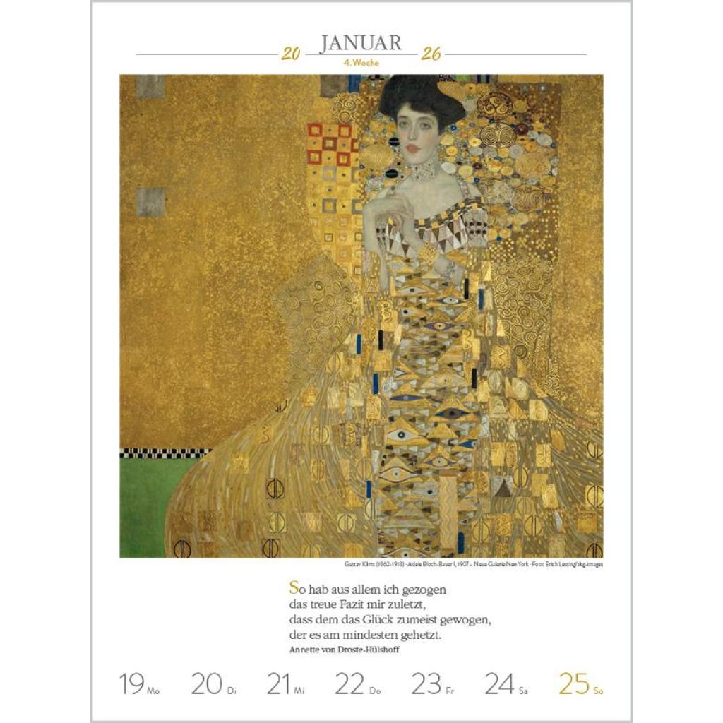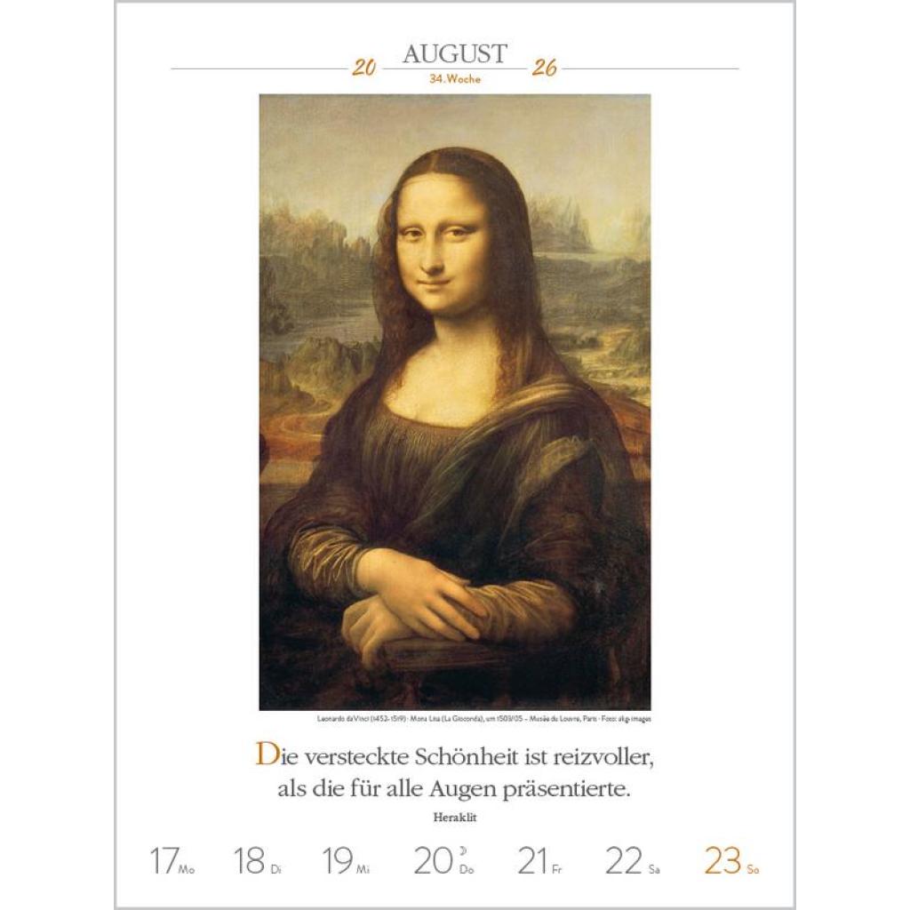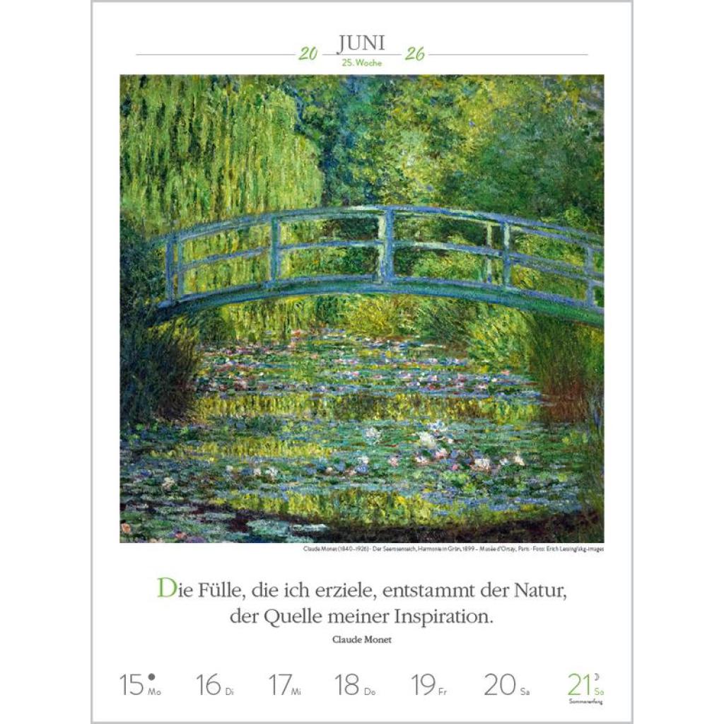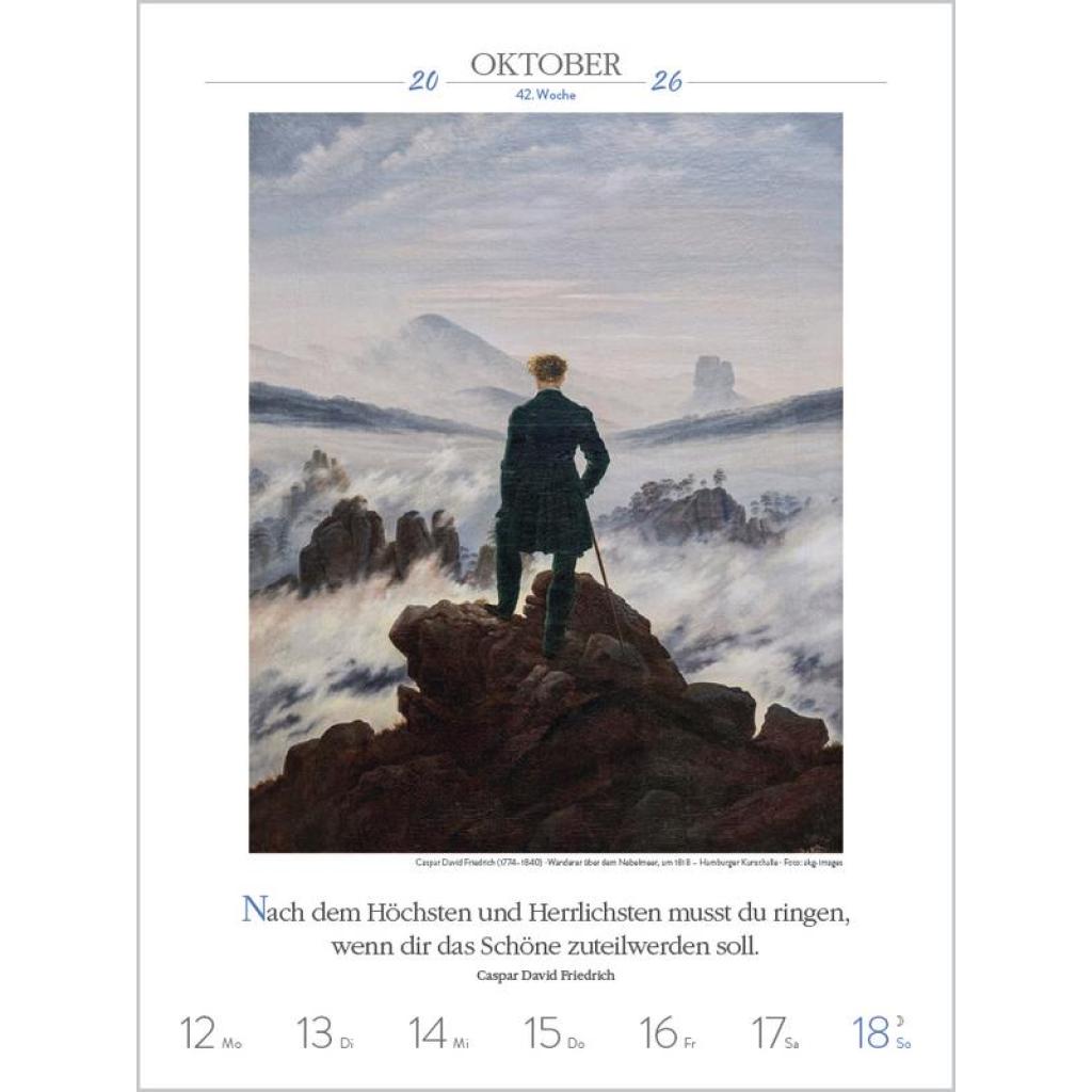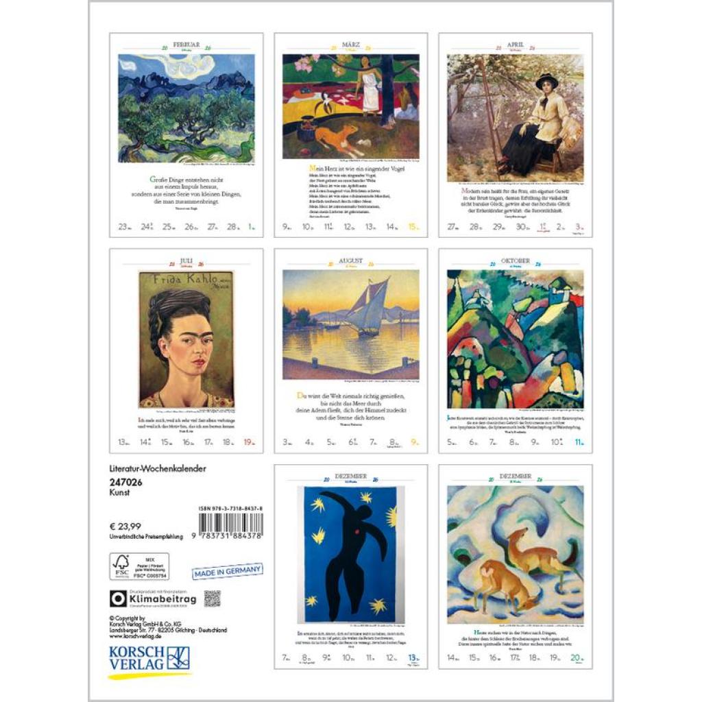Produktmerkmale ¿ Format: 24 x 32 cm; Literatur-Wochenkalender mit 53 einzigartigen Bildern und Zitaten ¿ Kalendarium auf Deutsch mit hervorgehobenen Sonn- und Feiertagen für D, A und CH ¿ Gedruckt auf umweltfreundlichem FSC Papier 53 Meisterwerke und inspirierende literarische Zitate präsentieren den faszinierenden Kosmos der Kunst von seiner schönsten Seite. Klimaneutral hergestellt auf nachhaltig produziertem Papier.